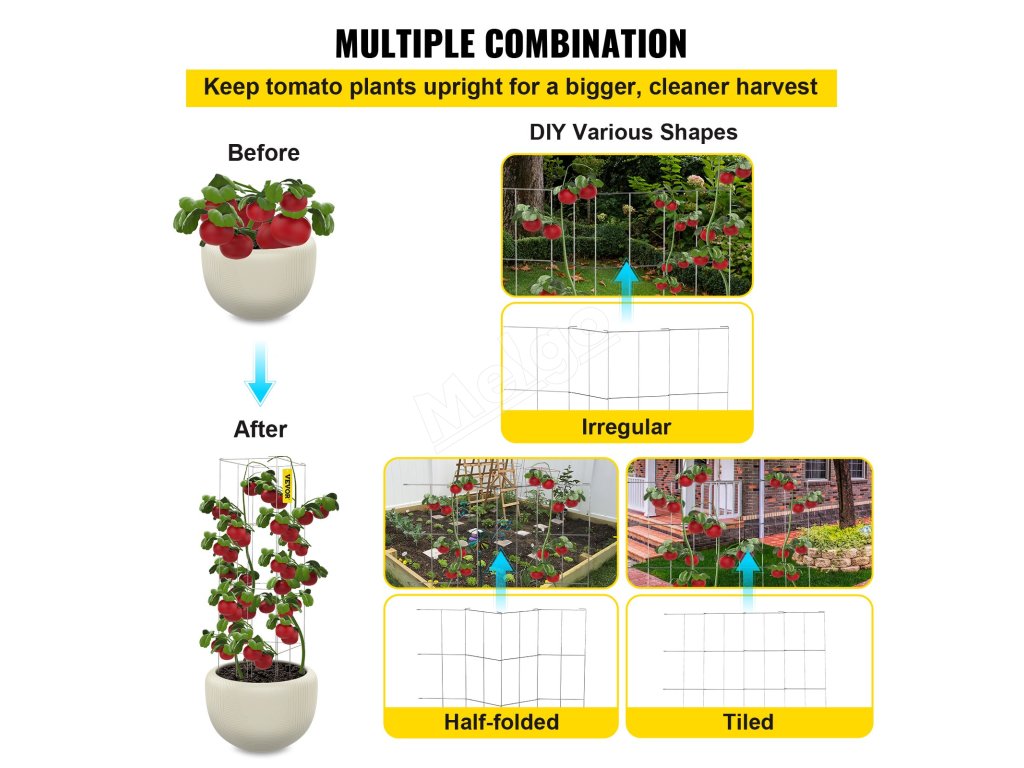 Skladacie klietky na paradajky sa dajú zostaviť do rôznych tvarov podľa vašich rôznych potrieb. Pri inštalácii klietok do nepravidelných, napoly zložených a plochých tvarov dbajte na hĺbku nožičiek v zemi.