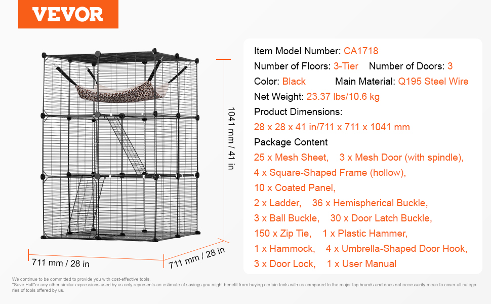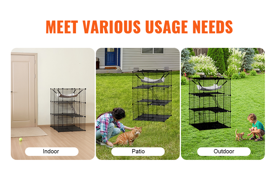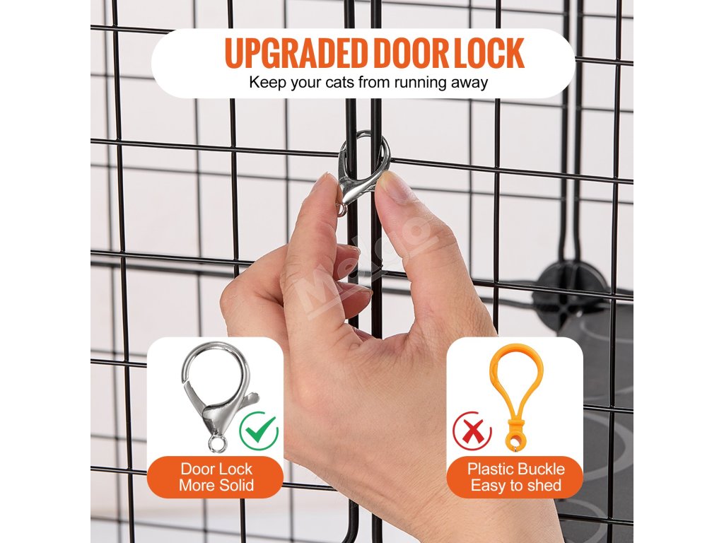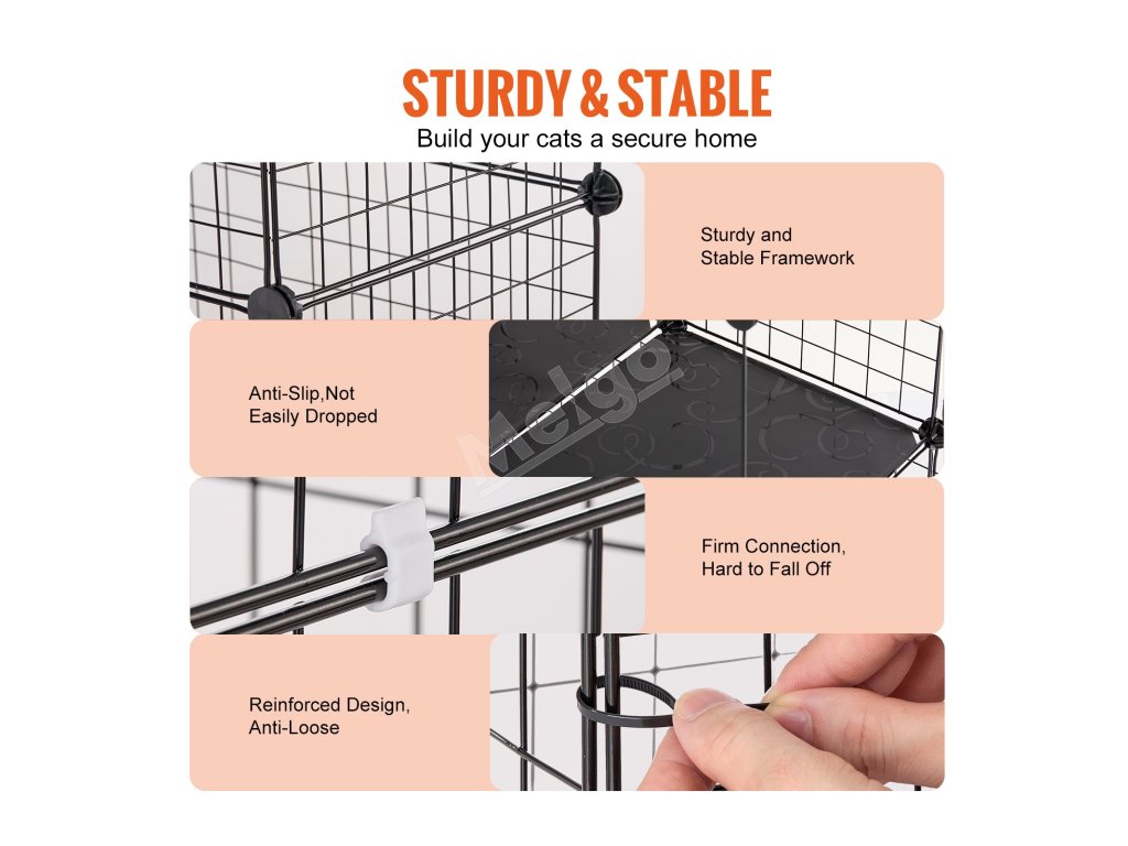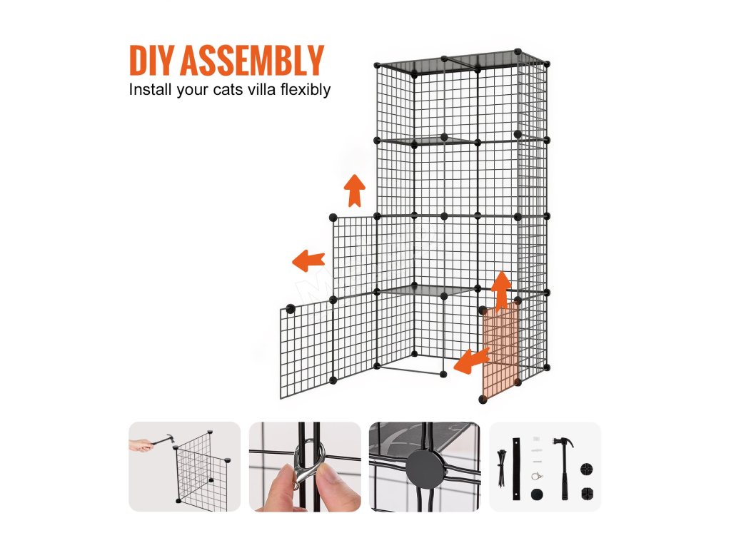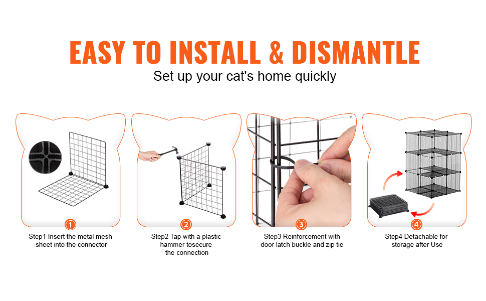 Táto ohrádka pre mačky, vybavená kovovými spojkami na každom paneli a zipsom, sa jednoducho montuje a demontuje. Ohrádku pre mačky môžete nainštalovať rýchlo bez potreby náradia. Klietka pre mačky sa dá úplne zložiť na pohodlné skladovanie a prenášanie, keď sa nepoužíva