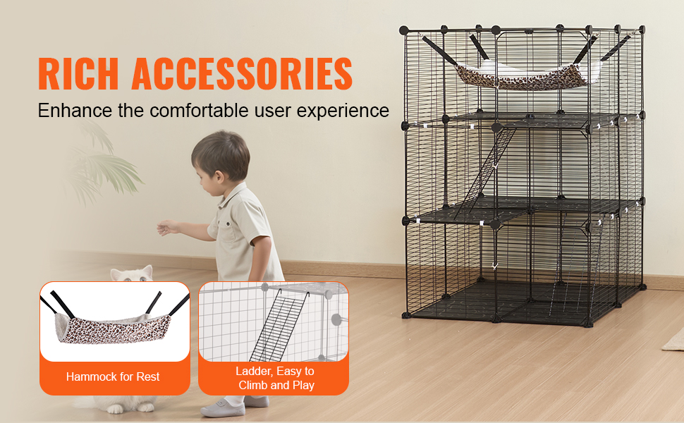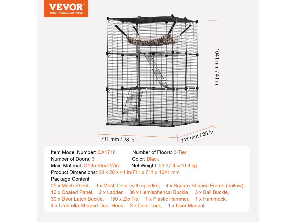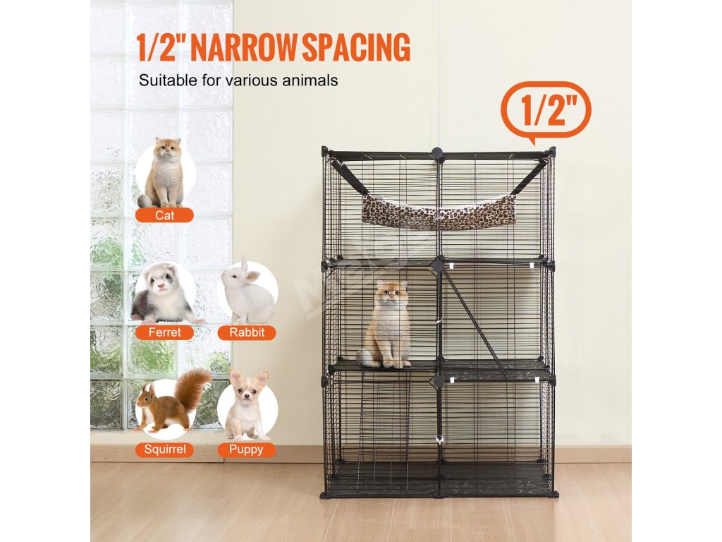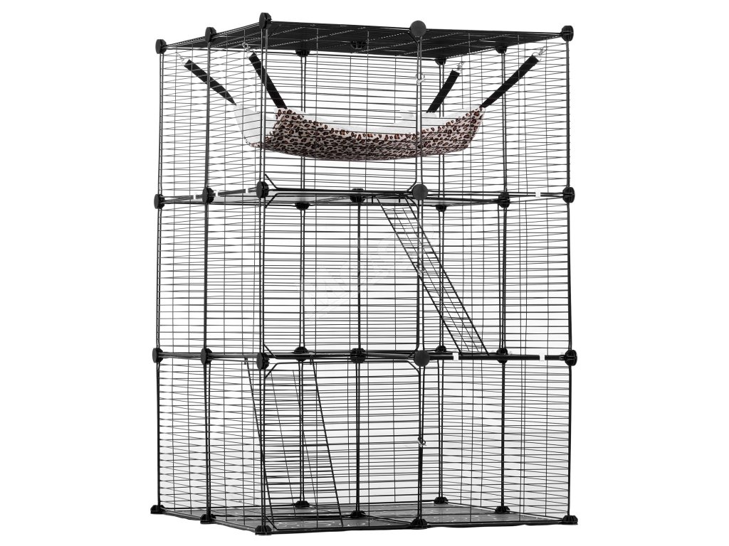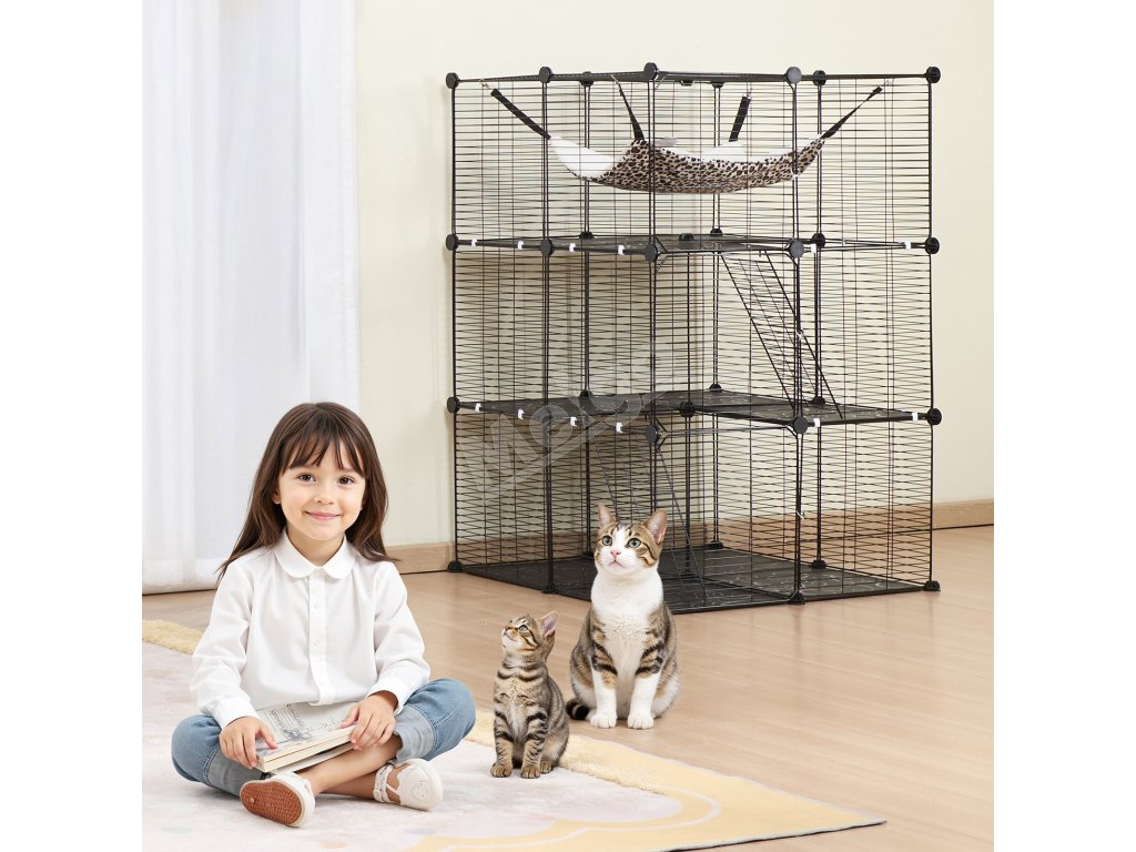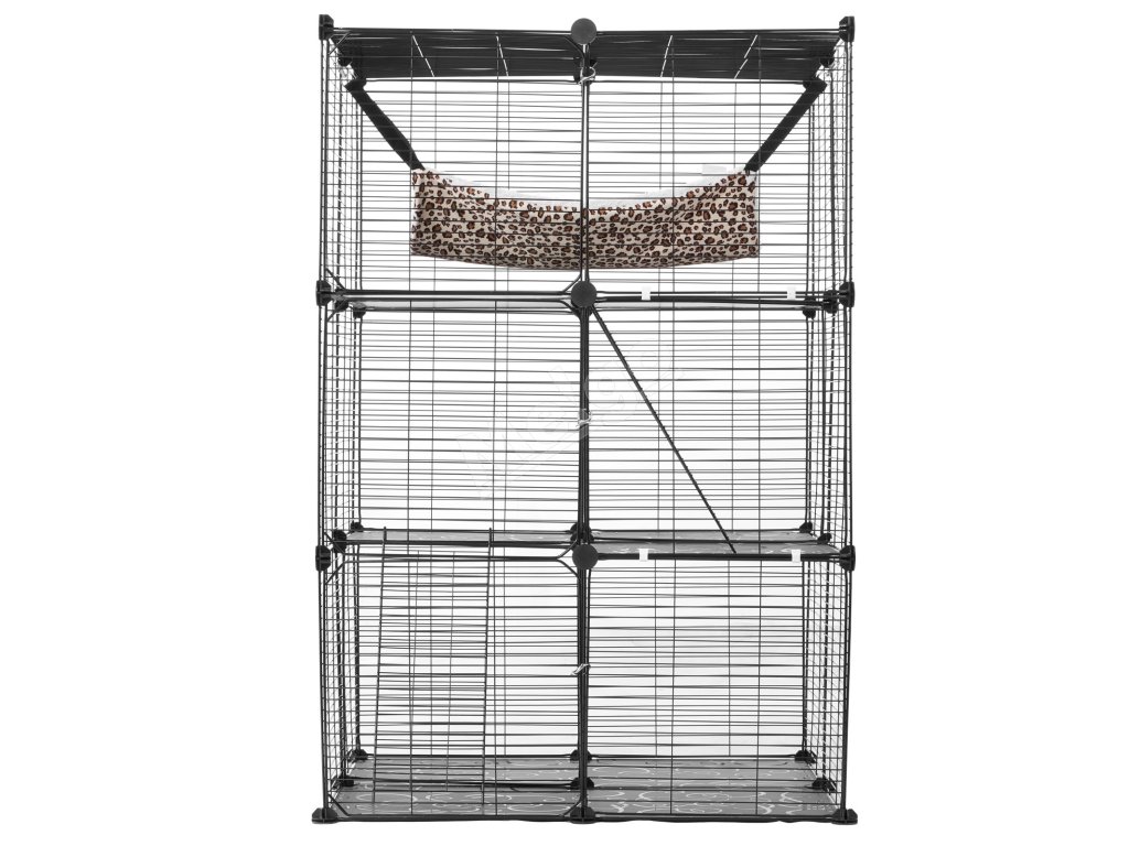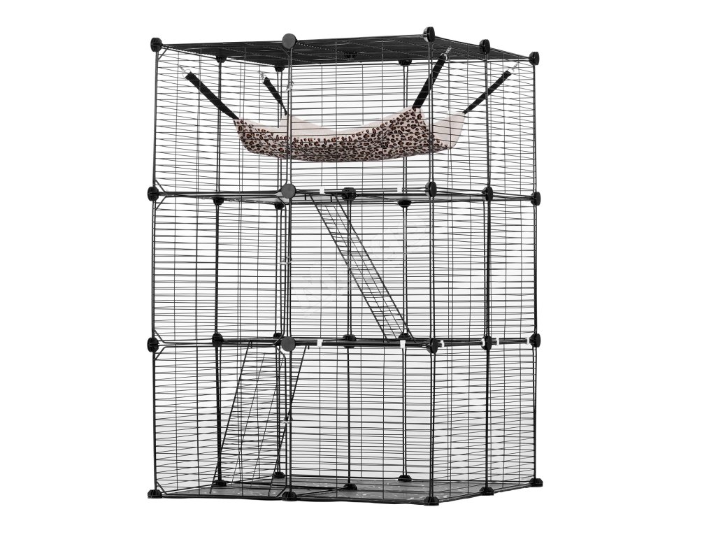 Trojúrovňová konštrukcia klietky pre mačky umožňuje rozdeliť klietku na priestor na kŕmenie, odpočinok a hranie zvlášť. Jej priestranný interiér dokáže uspokojiť každodenné potreby vašej mačky a vytvára veľké ihrisko pre vášho energického chlpatého priateľa vo všetkých fázach života.