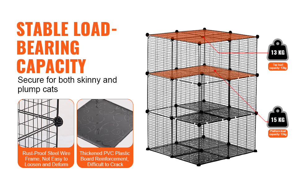Klietka pre mačky je podopretá pevnými kovovými rámami a zosilnenými plastovými doskami z PVC, ktoré sú celkom stabilné na hranie alebo odpočinok pre vychudnuté aj bacuľaté mačky. Váš mačací kamarát si môže byť istý, že si v našej mačacej klietke užije priestranný priestor na odpočinok.