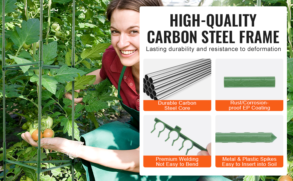 Táto klietka na podporu rastlín je vyrobená z vysokokvalitnej uhlíkovej ocele s práškovou povrchovou úpravou, je odolná proti korózii a skonštruovaná tak, aby vydržala. Jej pevná konštrukcia zaručuje spoľahlivosť a udržuje malé zvieratá mimo dosahu vašich rastlín.
