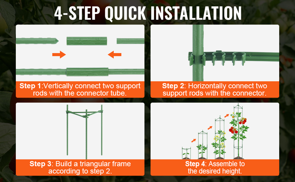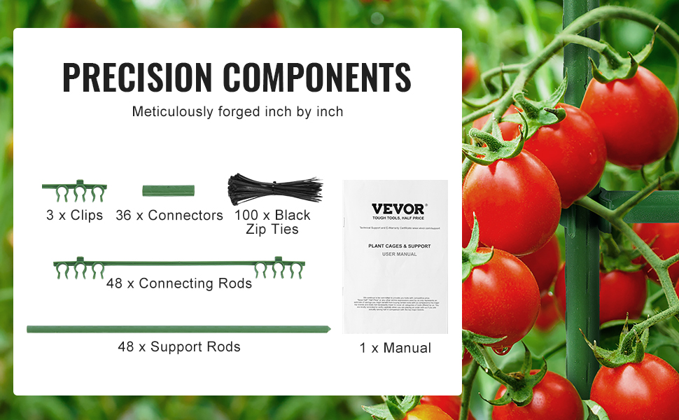 Súprava veže na paradajky obsahuje 48 spojovacích tyčí, 48 podporných tyčí, 36 spojovacích rúrok, 3 svorky, 100 čiernych zipsových viazacích pások a 1 návod. Každý komponent je jemne kovaný pre dosiahnutie tvrdosti a odolnosti proti korózii, čo zaručuje dlhodobú životnosť.