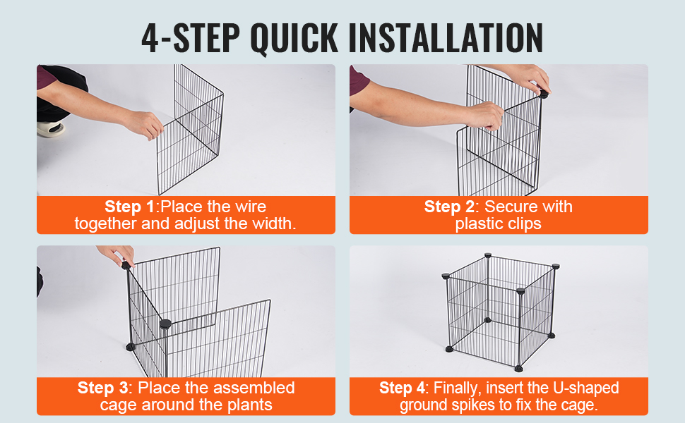 Záhradná klietka sa ľahko nastavuje pomocou priložených čiernych zipsov na spojenie kovového pletiva. Keď sa nepoužíva, možno ju ľahko rozobrať a uskladniť, čím sa šetrí miesto.