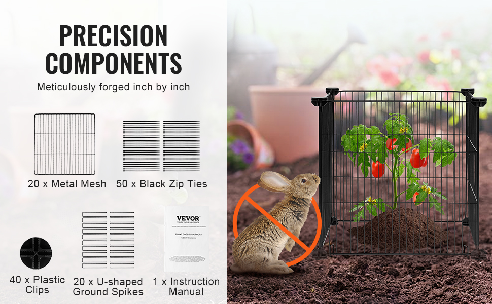 Súprava na ochranu rastlín z kuracieho drôtu obsahuje 20 ks kovového pletiva, 40 plastových svoriek, 20 zemných hrotov v tvare písmena U, 50 čiernych zipsov a návod. Každý komponent je jemne kovaný pre dosiahnutie tvrdosti a odolnosti proti korózii, čo zaručuje dlhodobú životnosť.