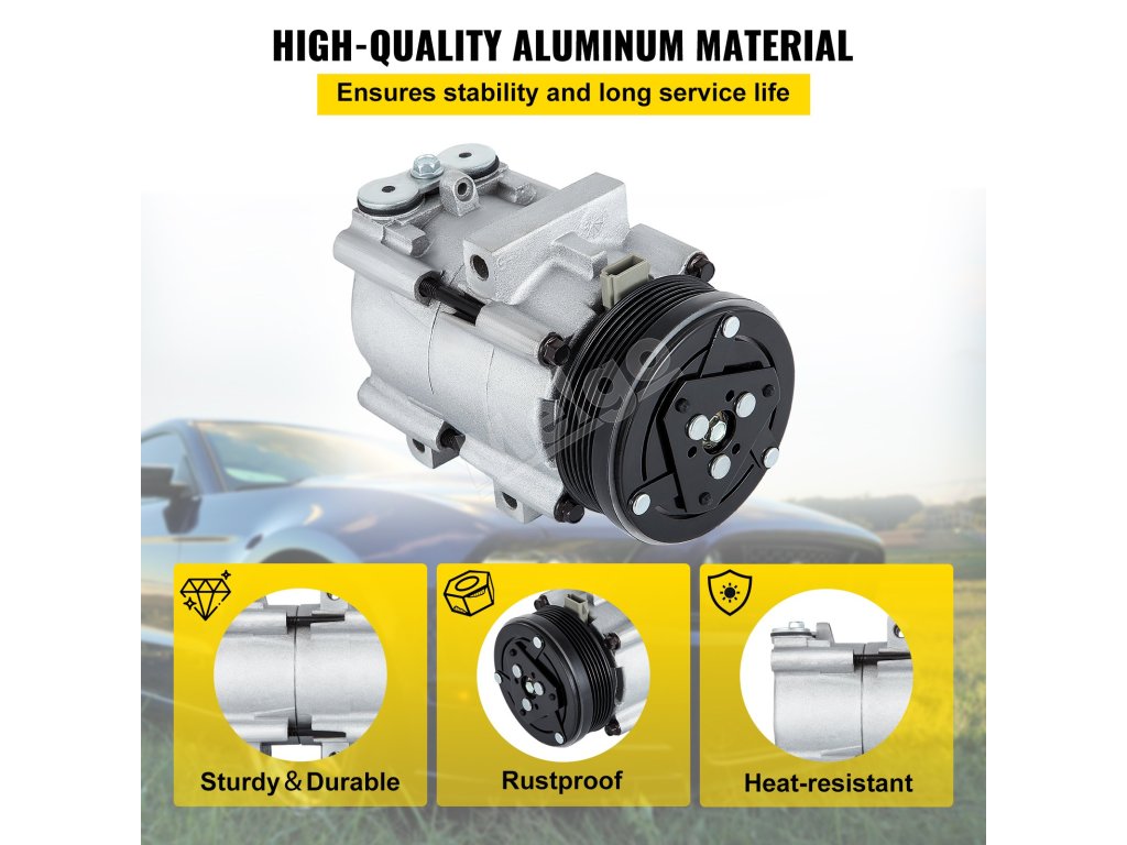 Tento kompresor automatickej klimatizácie je vyrobený z odolnej hliníkovej zliatiny a je odolný voči vysokým teplotám a vysokému tlaku, čo zaručuje dlhodobé používanie. Vnútorné časti sú mazané, aby boli odolné voči korózii.