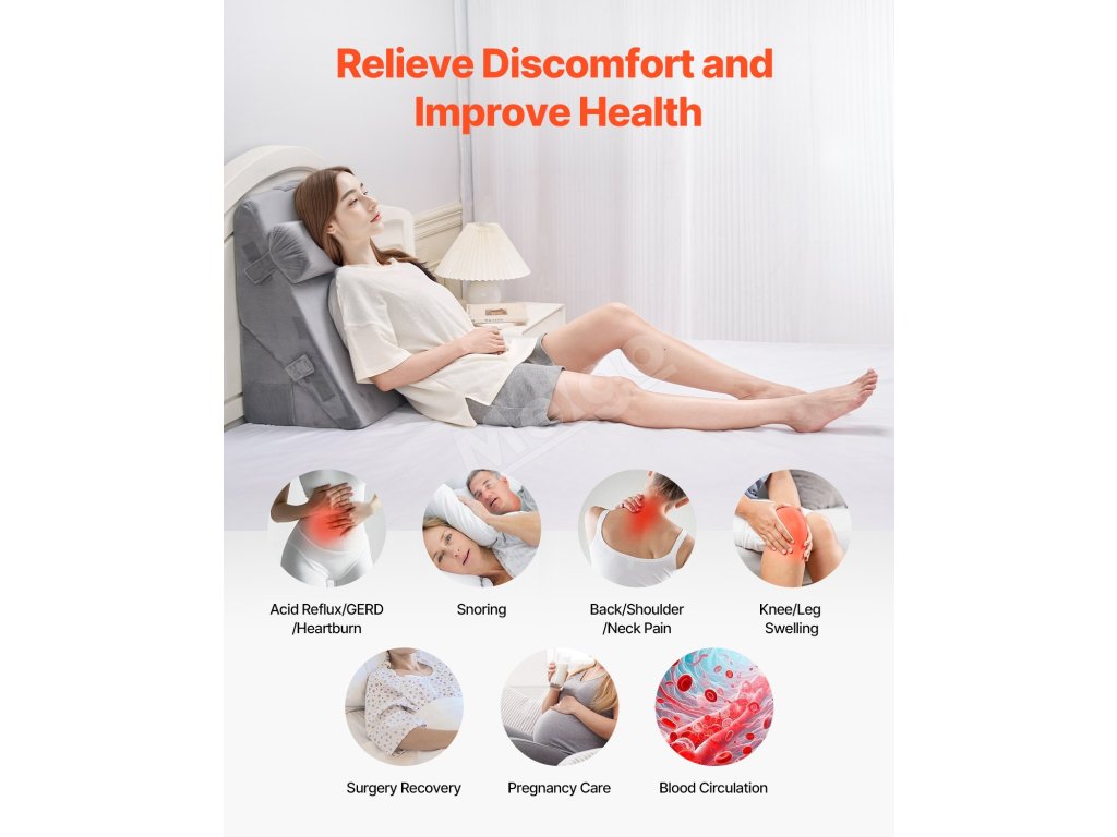 Naklonená konštrukcia tohto chirurgického vankúša na spanie pomáha zmierniť chrápanie, reflux kyseliny, bolesti chrbta, opuchy nôh a ďalšie problémy, čím podporuje rýchlejší spánok a znižuje fyzické nepohodlie.