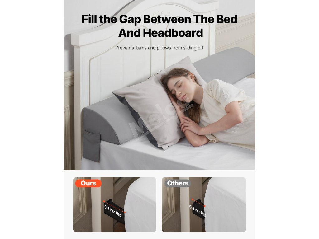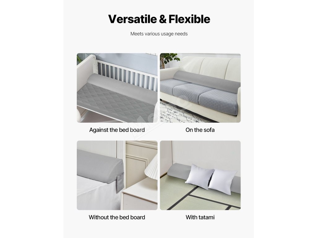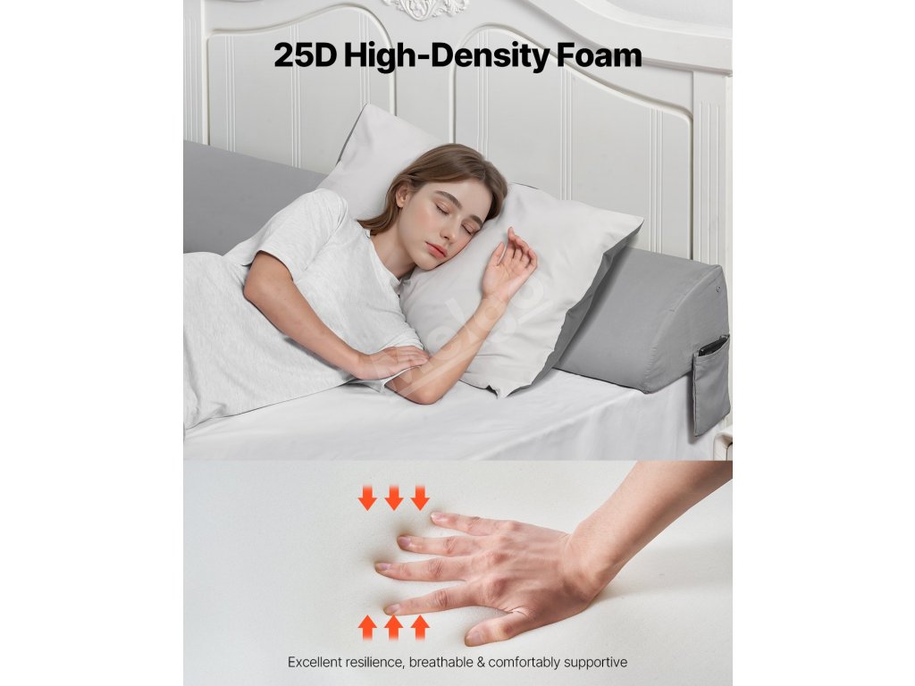 Naša výplň medzier v posteli je vyrobená z 25D peny s vysokou hustotou pre mäkkú oporu a je priedušná. Veľké bočné vrecko slúži na uloženie telefónov, okuliarov a diaľkových ovládačov. Odnímateľná obliečka na vankúš sa ľahko čistí a protišmykové dno udrží vankúš na mieste pre pohodlný spánok.