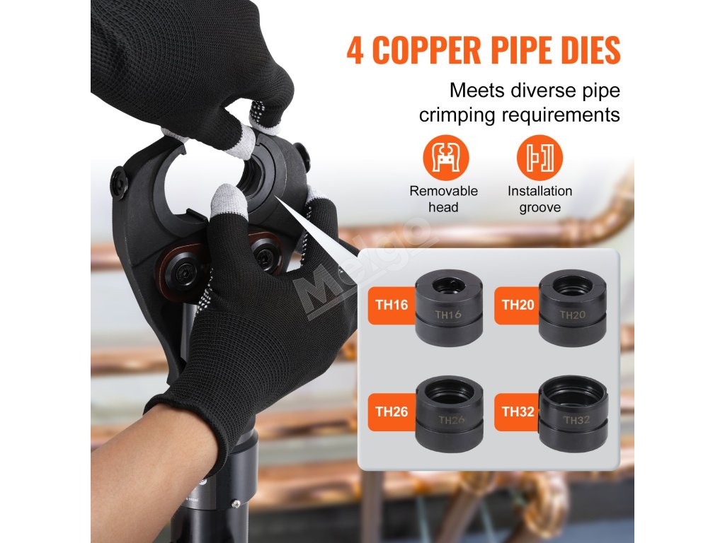 Náš lisovací nástroj na meď je vybavený 4 lisovacími matricami, ktoré pokrývajú rozmery TH16, TH20, TH26, TH32, čím spĺňajú potreby lisovania rôznych veľkostí rúr.