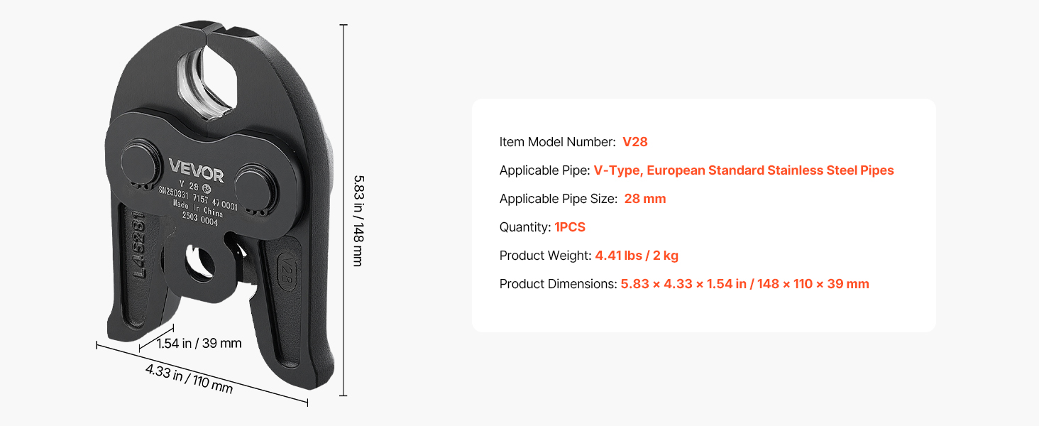 Dosiahnite presné lisovanie a bezpečné spoje rúr s 28 mm lisovacími čeľusťami VEVOR, ktoré sú určené pre európske štandardné rúry z nehrdzavejúcej ocele typu V. Táto lisovacia čeľusť, kompatibilná so štandardnými elektrickými lisovacími nástrojmi, je efektívnym riešením pre rôzne potrubné aplikácie.