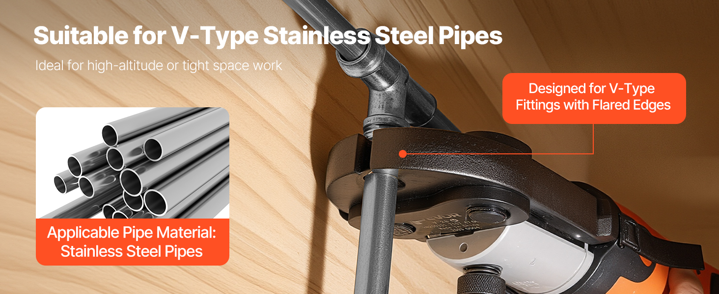 Vhodná pre rúry typu V z európskej štandardnej nehrdzavejúcej ocele a tvarovky typu V potrebujú rozšírené hrany na zabezpečenie správneho, presného a bezpečného lisovania a spojenia.
