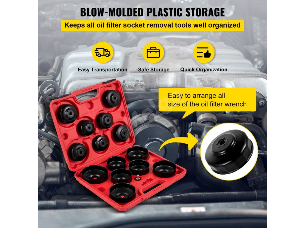 Obsahuje 14 kusov, čo vám zaručí správnu veľkosť pre väčšinu filtrov. Súprava je určená pre rôzne značky a modely. Dobre funguje so zahraničnými aj domácimi vozidlami. Vďaka tejto všestrannosti je nevyhnutným nástrojom pre každého majiteľa vozidla. Táto súprava vás pokryje od bežných automobilov až po špecializované modely. Tieto viaceré veľkosti zaisťujú vždy dokonalú montáž. Už nemusíte bojovať s nepoddajnými filtrami. Táto sada kľúčov na olejové filtre vám zjednoduší rutinnú údržbu. Je navrhnutá tak, aby bola výmena oleja rýchlejšia a jednoduchšia. To vám z dlhodobého hľadiska ušetrí čas a námahu.