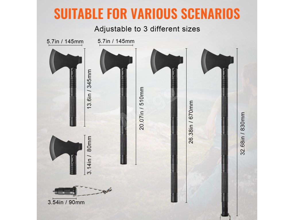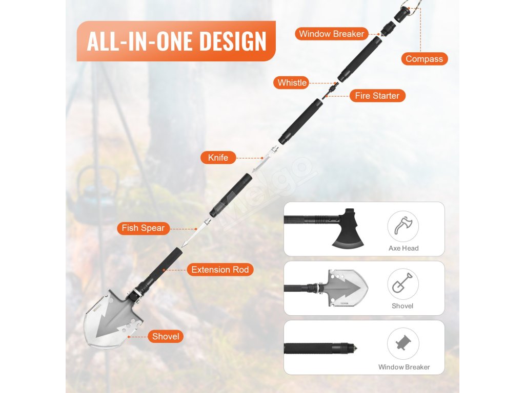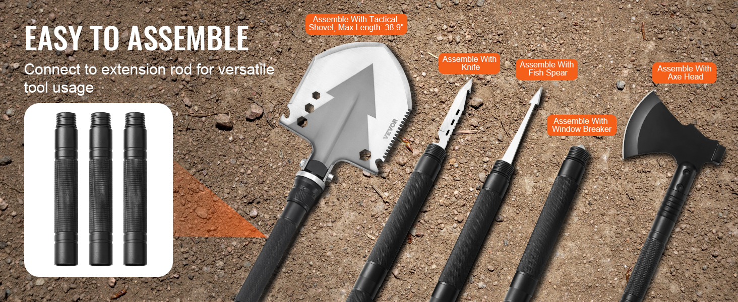 Prenosnú multitool lopatu na prežitie môžete zostaviť s predlžovacími tyčami, aby ste maximalizovali funkčnosť a prispôsobili každý nástroj na viac použití!