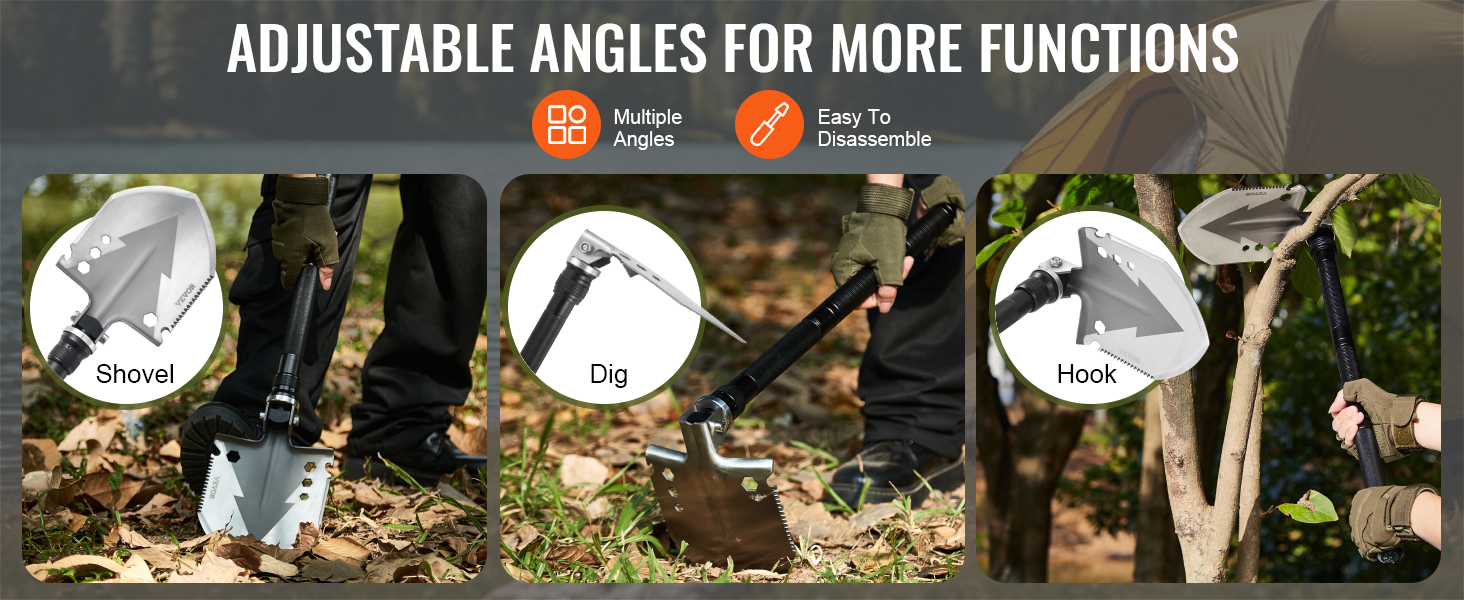 Taktická lopata ponúka nastavenie uhla na zvýšenie funkčnosti, čo vám umožní kopať, okopávať, hĺbiť alebo dokonca hákovať konáre stromov, čím poskytuje všestrannosť v akomkoľvek vonkajšom prostredí.