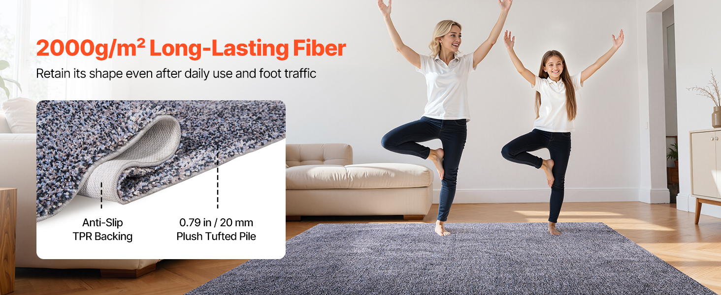 Tento plyšový koberec, navrhnutý na každodenný život, kombinuje odolný povrch z vlákien so spodnou časťou z TPR, ktorá pevne drží na mieste. Jeho hustá väzba zabraňuje tomu, aby sa koberec vysypal alebo stratil tvar, takže aj po častom chodení, sedení alebo leňošení zostane úhľadný a odolný.