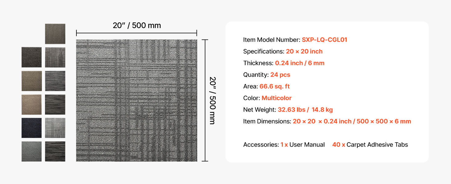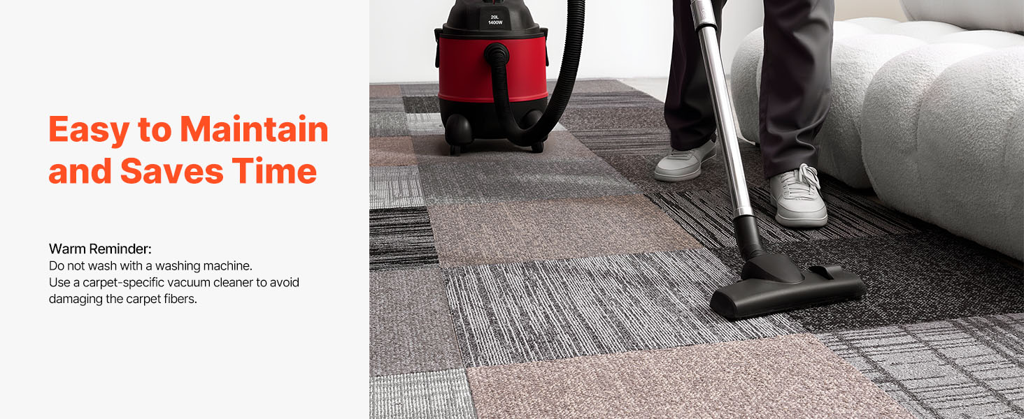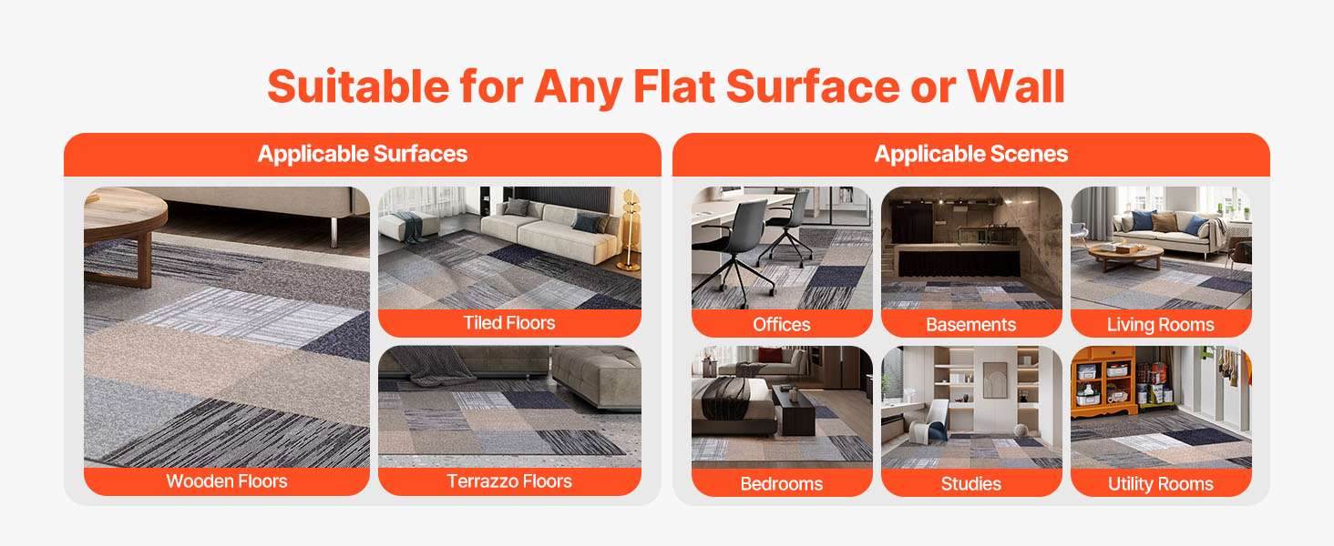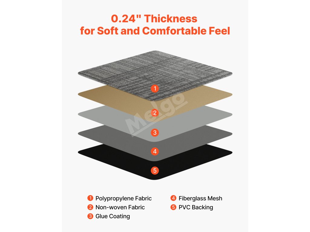 Tieto modulárne kobercové dlaždice sú univerzálne a ľahko sa používajú, majú povrch s nízkym vlasom, ktorý sa jednoducho udržiava. Poškodené alebo opotrebované dlaždice môžete kedykoľvek a kdekoľvek vymeniť - je to praktické a štýlové. Ideálne pre domácnosti, kancelárie, prenájmy alebo akékoľvek priestory, ktoré potrebujú flexibilnú, bezproblémovú podlahovú krytinu.