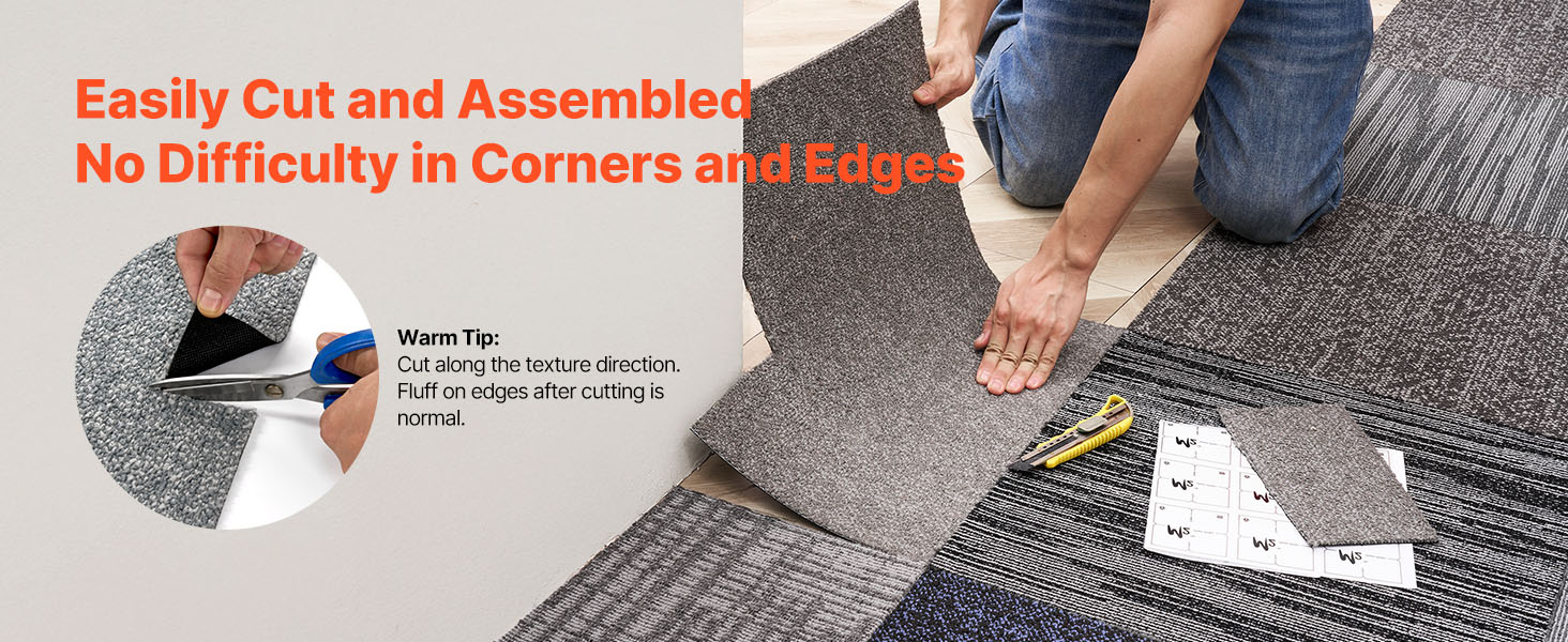 Každú kobercovú dlaždicu možno ľubovoľne narezať do akéhokoľvek tvaru alebo veľkosti, čo uľahčuje pokrytie nepravidelných priestorov a dosiahnutie pokrytia celej miestnosti bez problémov.