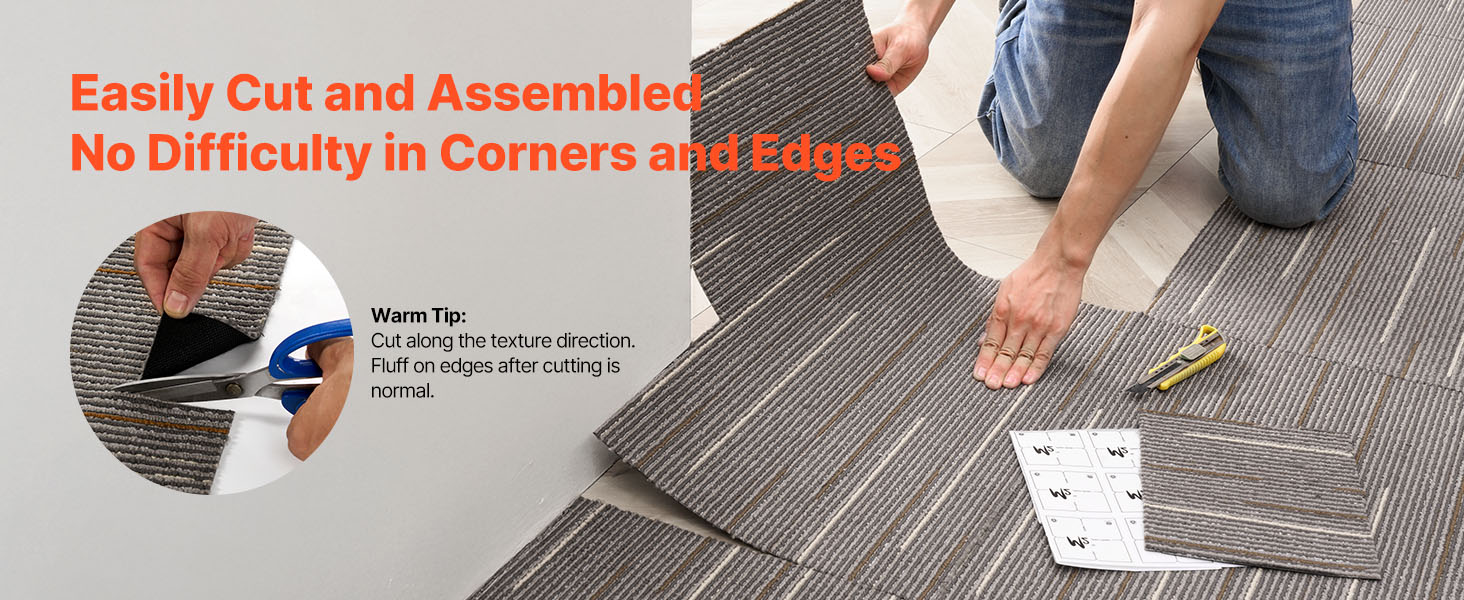 Každú kobercovú dlaždicu možno ľubovoľne narezať do akéhokoľvek tvaru alebo veľkosti, čo uľahčuje pokrytie nepravidelných priestorov a dosiahnutie pokrytia celej miestnosti bez problémov.
