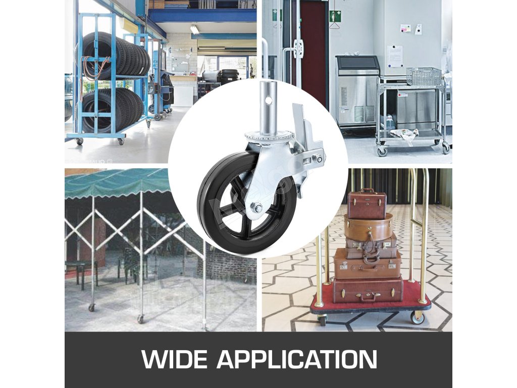 Sú kolieska na lešenie VEVOR sú navrhnuté tak, aby zlepšovali mobilitu. Ich 360-stupňová rotácia zabezpečuje plynulý a jednoduchý pohyb. Tieto kolieska umožňujú jednoduchú zmenu smeru. Sú ideálne na všetko od betónu až po trávu. Dvojitý blokovací mechanizmus zaisťuje bezpečnosť a stabilitu. Zablokujte koleso aj otočné koliesko súčasne. Táto funkcia je nevyhnutná na bezpečné a stabilné používanie. Uľahčuje premiestňovanie veľkého vybavenia. Použite ich na letové kufre, výstavné zariadenia alebo stroje. S týmito kolieskami môžete ľahko premiestňovať veľké zariadenia. Zvýšte svoju mobilitu a výdrž pomocou týchto koliesok.