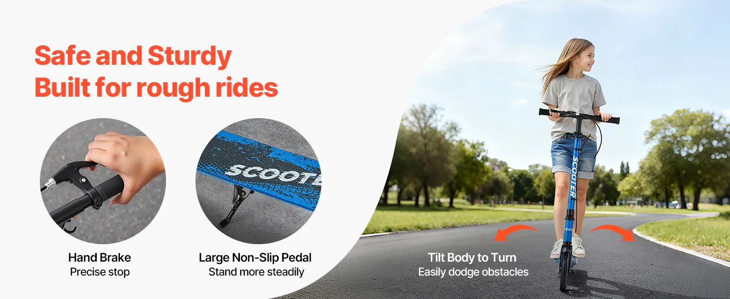 Naša detská kopacia kolobežka je vybavená protišmykovými krytmi rukoväte pre bezpečné uchopenie, ktoré zabezpečujú, že sa ľahko nevyšmykne z malých rúk.