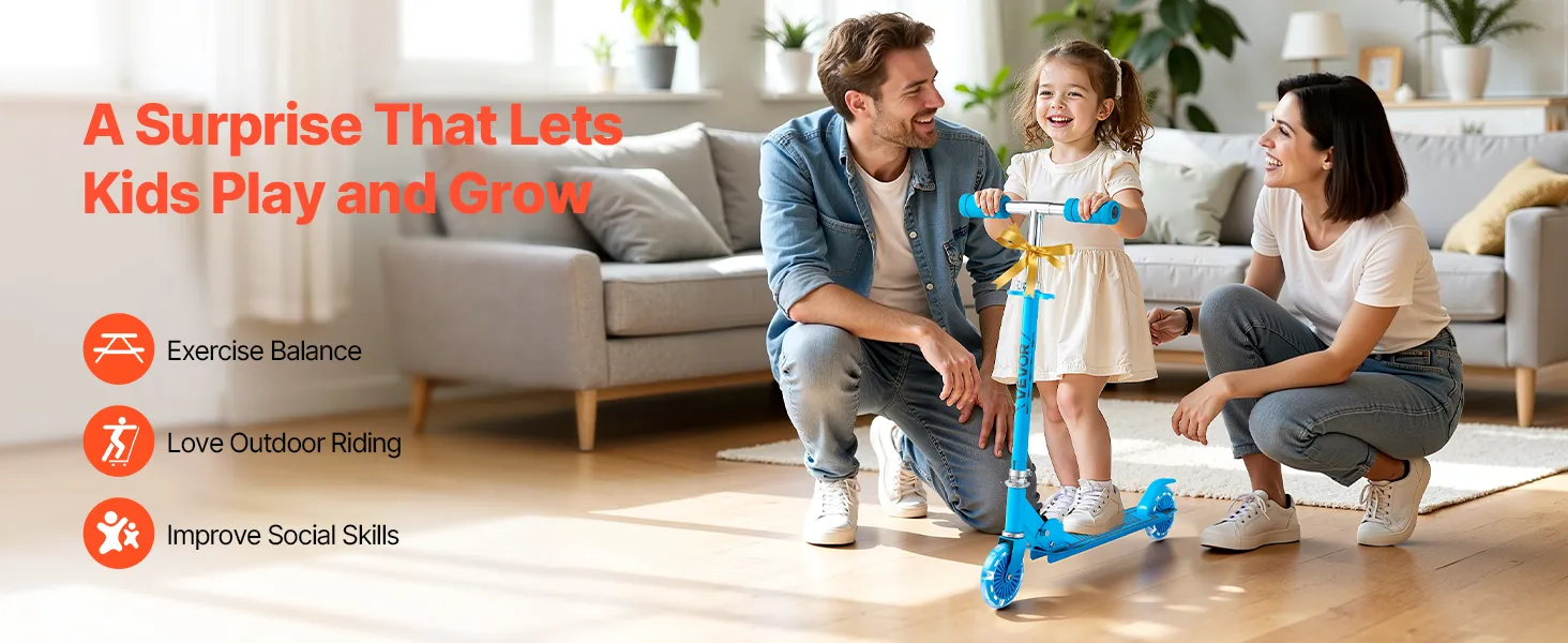 Táto detská kopacia kolobežka je určená pre deti vo veku 3+ a prináša aktívnu zábavu do detstva. Jej odolná konštrukcia a veľké kolesá zabezpečujú plynulú jazdu v interiéri aj exteriéri a rodičom poskytujú pokoj. Riadenie v náklone pomáha rozvíjať rovnováhu a koordináciu a začiatočníci môžu jazdu zvládnuť hneď.