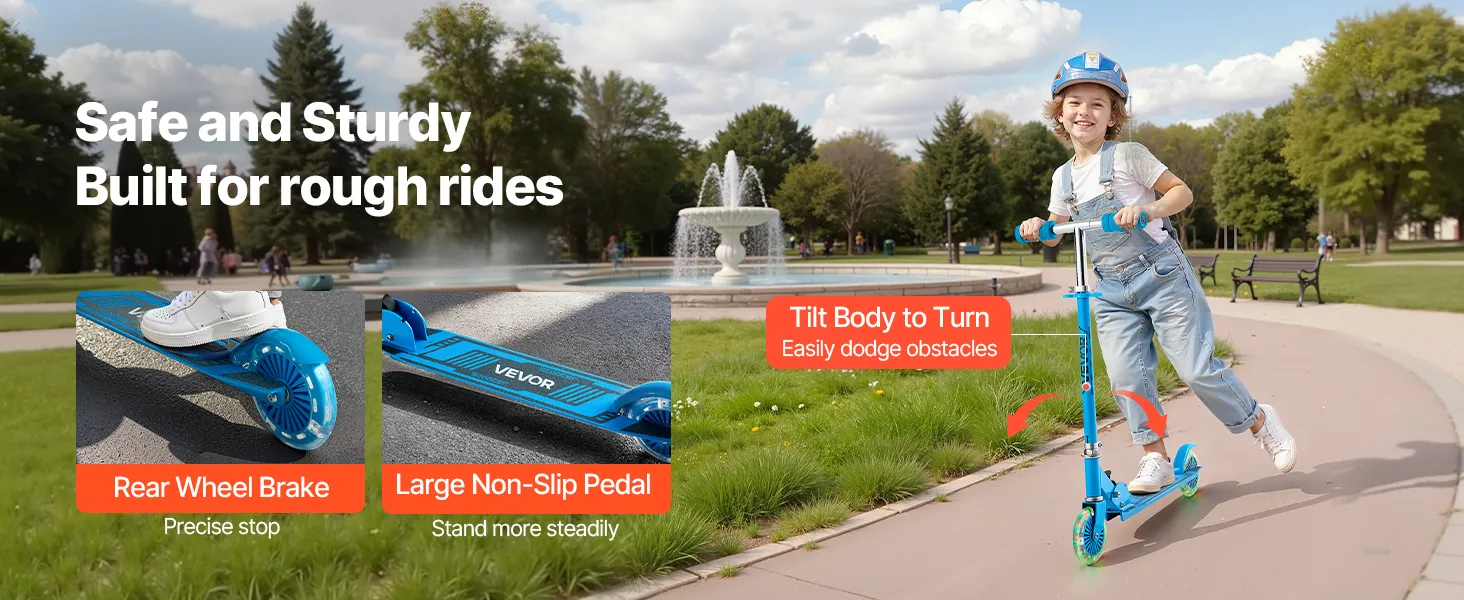 Naša detská kopacia kolobežka je vybavená protišmykovými krytmi rukoväte pre bezpečné uchopenie, ktoré zabezpečujú, že sa ľahko nevyšmykne z malých rúk.