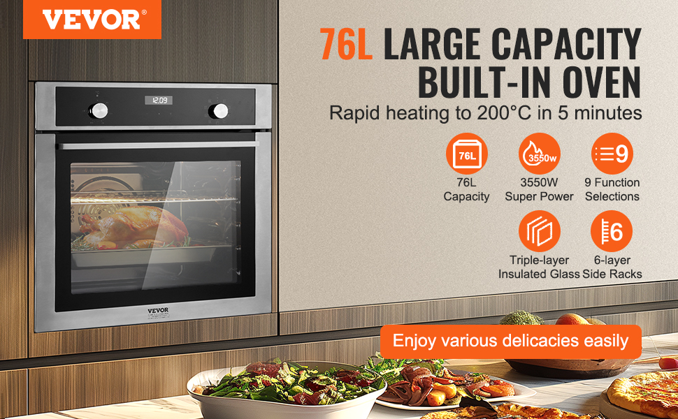 Táto nástenná rúra s veľkým objemom 76 l a vysokým výkonom 3550 W sa dokáže rýchlo zohriať na 200 °C v priebehu 5 minút, čím skracuje čas predhrievania a rýchlo dosahuje teplotu pečenia, čím odomkne chutné jedlá bez čakania.