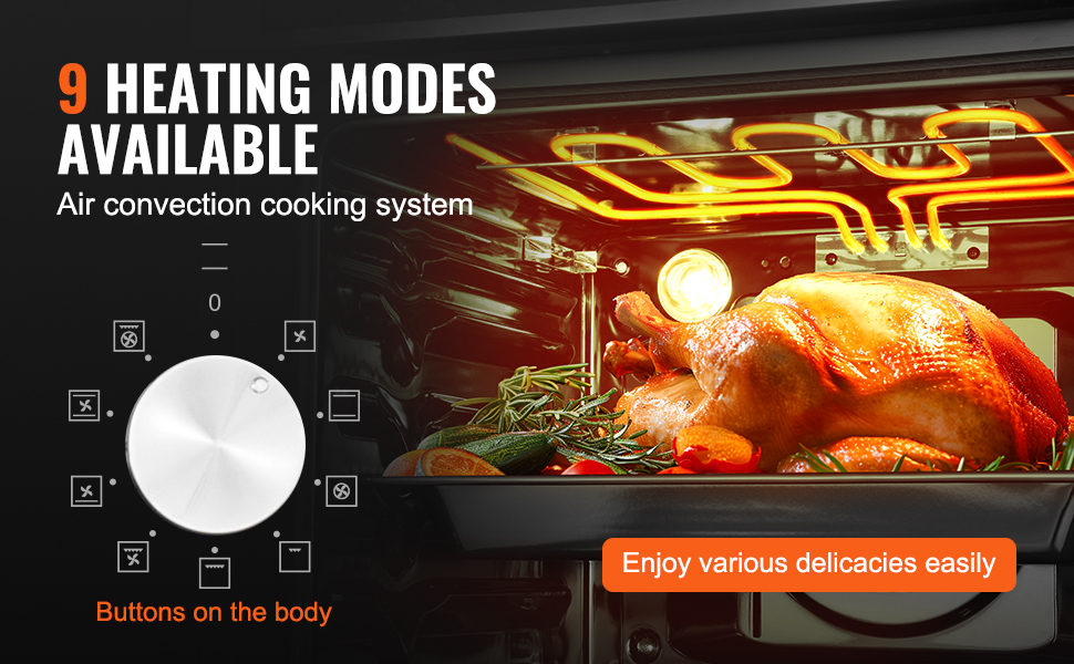 Vyberte si z 9 funkčných režimov s výkonným konvekčným systémom varenia, ktorý rovnomerne cirkuluje horúci vzduch zo všetkých strán, čím poskytuje ideálne teploty a prúdenie vzduchu na rýchle predhriatie a rovnomerné varenie.