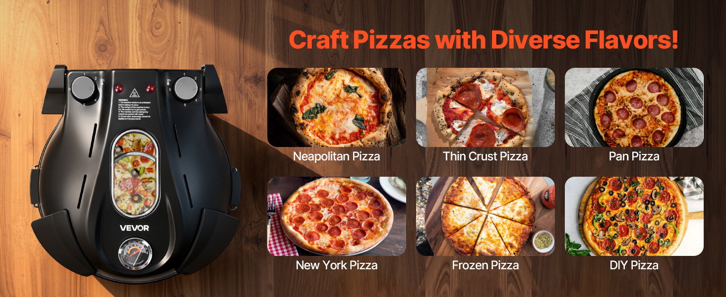 Tento stolový pizza stroj poskytuje dostatok priestoru na pečenie a vy si môžete svoju obľúbenú pizzu prispôsobiť podľa svojich predstáv. Pridaním rôznych príchutí náplní si môžete vychutnať zábavu pri domácom varení "urob si sám"!