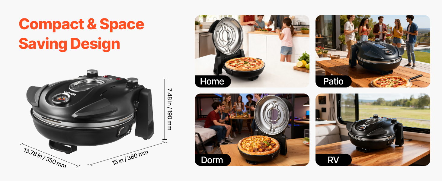 Vďaka kompaktným rozmerom a nízkej hmotnosti sa tento stroj na pizzu ľahko prenáša. Či už v interiéri alebo vonku, môžete si užiť zábavu s domácou pizzou kedykoľvek a kdekoľvek a začať chutnú párty pečenia s rodinou a priateľmi!