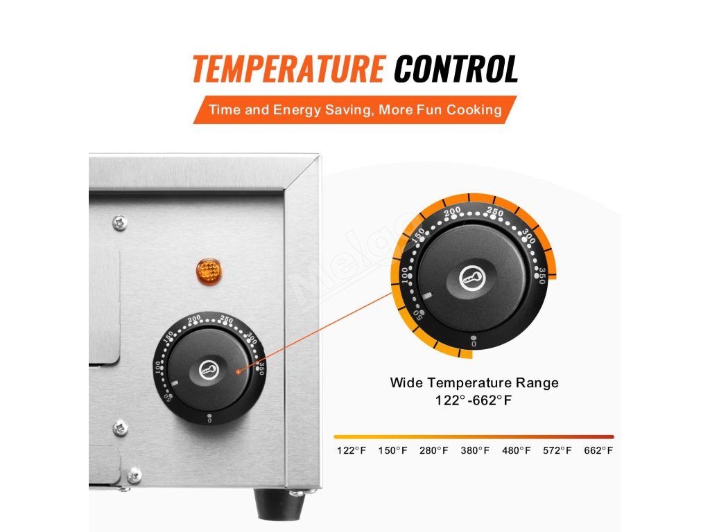 teplotný rozsah 122-662℉/50-350 ℃: Vďaka tomuto starostlivo kalibrovanému nastaveniu teploty dosiahnete presné a konzistentné výsledky. Zaručuje, že vaše pečivo bude zakaždým dokonale upečené, či už ide o chrumkavú pizzu, zlatisté praclíky alebo vlhké koláče.