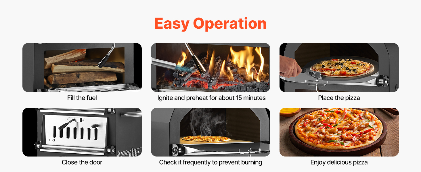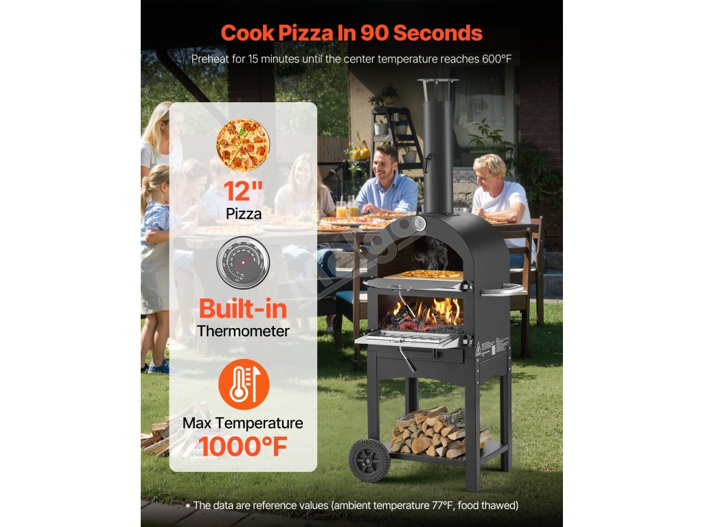 Dosiahnite pôsobivú teplotu 600 °C už za 15 minút a pizzu máte hotovú už za 90 sekúnd! Rozlúčte sa s dlhým čakaním - vychutnajte si rýchlu, chrumkavú pizzu za okamih! Vďaka priloženým kolieskam je premiestňovanie pece na pizzu hračka, takže si môžete ľahko vychutnať pizza párty alebo kempovanie s priateľmi.
