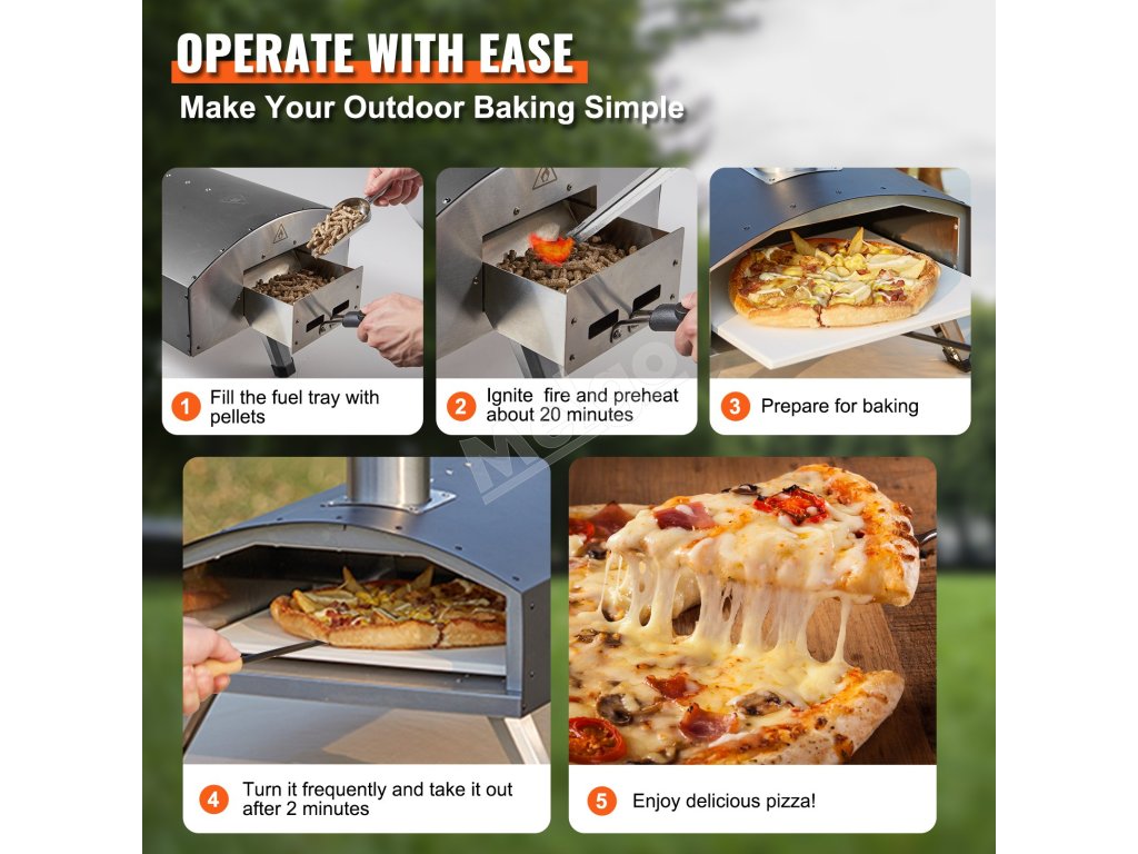 Táto pec na pizzu na dvore je vďaka jednoduchej montáži pripravená na použitie hneď po vybalení z krabice. Stačí naplniť zásobník paliva, zapáliť oheň a začať variť. Vďaka užívateľsky prívetivému dizajnu je ideálna pre každého, dokonca aj pre tých, ktorí s varením vonku začínajú. Či už ide o rodinnú oslavu alebo príležitostné grilovanie, vychutnajte si chutné jedlá jednoducho a bez problémov.