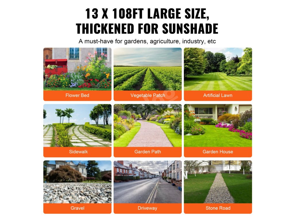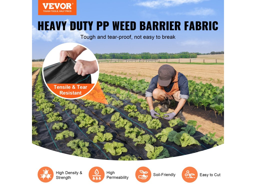 Rozlúčte sa s tvrdohlavou burinou! Tkaná bariérová textília VEVOR 13x108 ft, 5,0 OZ s vysokou hustotou sa môže pochváliť výnimočnou priepustnosťou a priedušnosťou a zároveň ponúka vynikajúcu odolnosť proti roztrhnutiu, korózii a erózii. Zlepšuje zdravie pôdy tým, že kontroluje rast burín, a chráni záhradu s istotou.