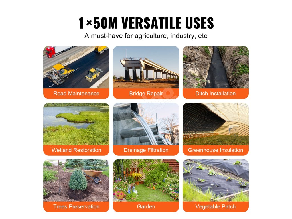 Rozlúčte sa s tvrdohlavou burinou! Krajinná textília VEVOR 3,28 × 164 ft, 4,43 OZ s vysokou hustotou proti burine sa môže pochváliť výnimočnou priepustnosťou a priedušnosťou, pričom ponúka odolnosť proti roztrhnutiu, korózii a erózii. Zlepšuje zdravie pôdy tým, že kontroluje rast burín, a chráni záhradu s istotou.