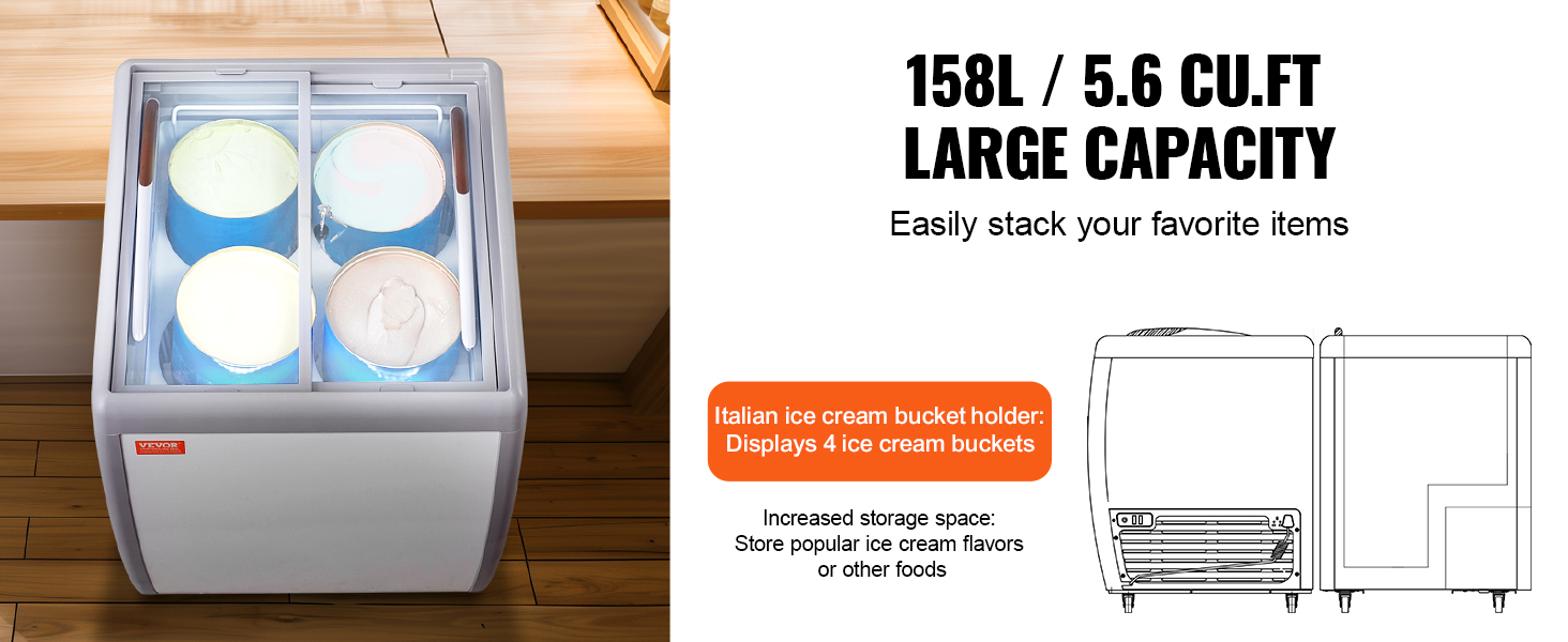 Veľké výstavné vane, ktoré dokážu prezentovať rôzne príchute zmrzliny. Priehľadné sklenené dvere a LED osvetlenie zvyšujú efekt vystavenia.