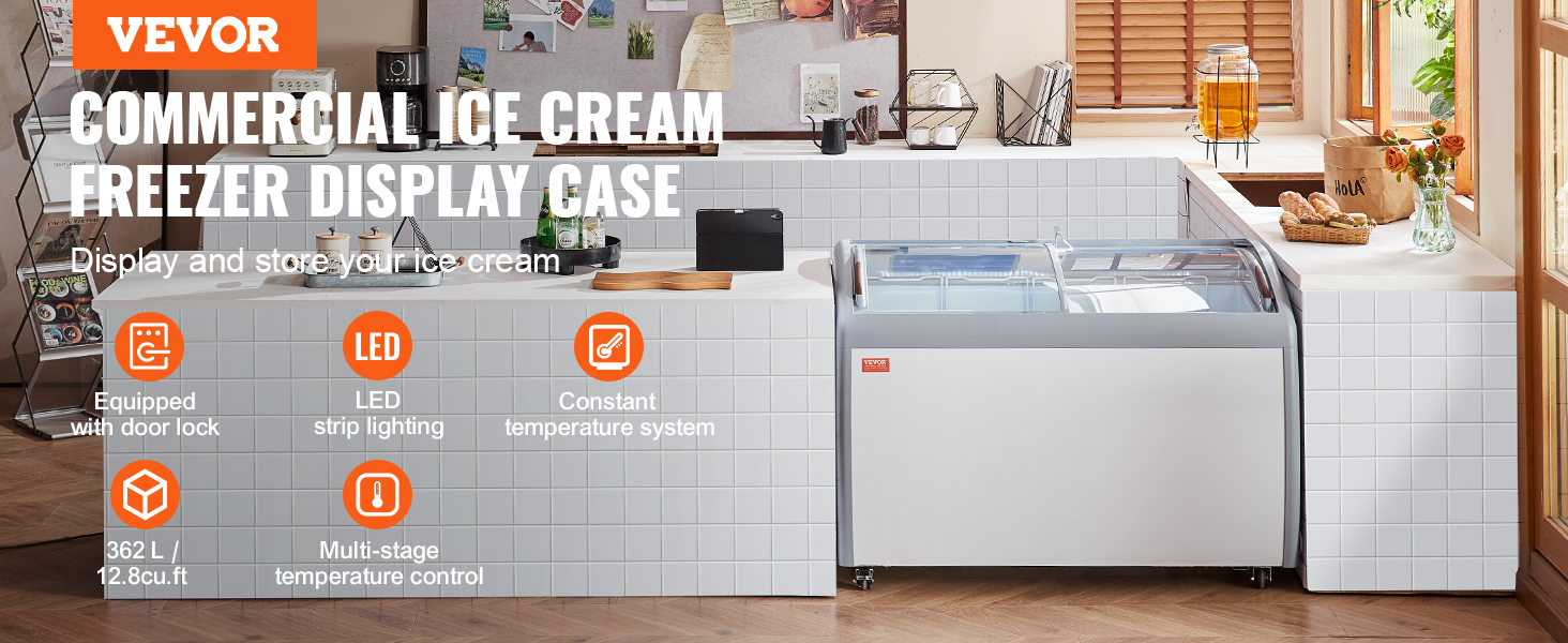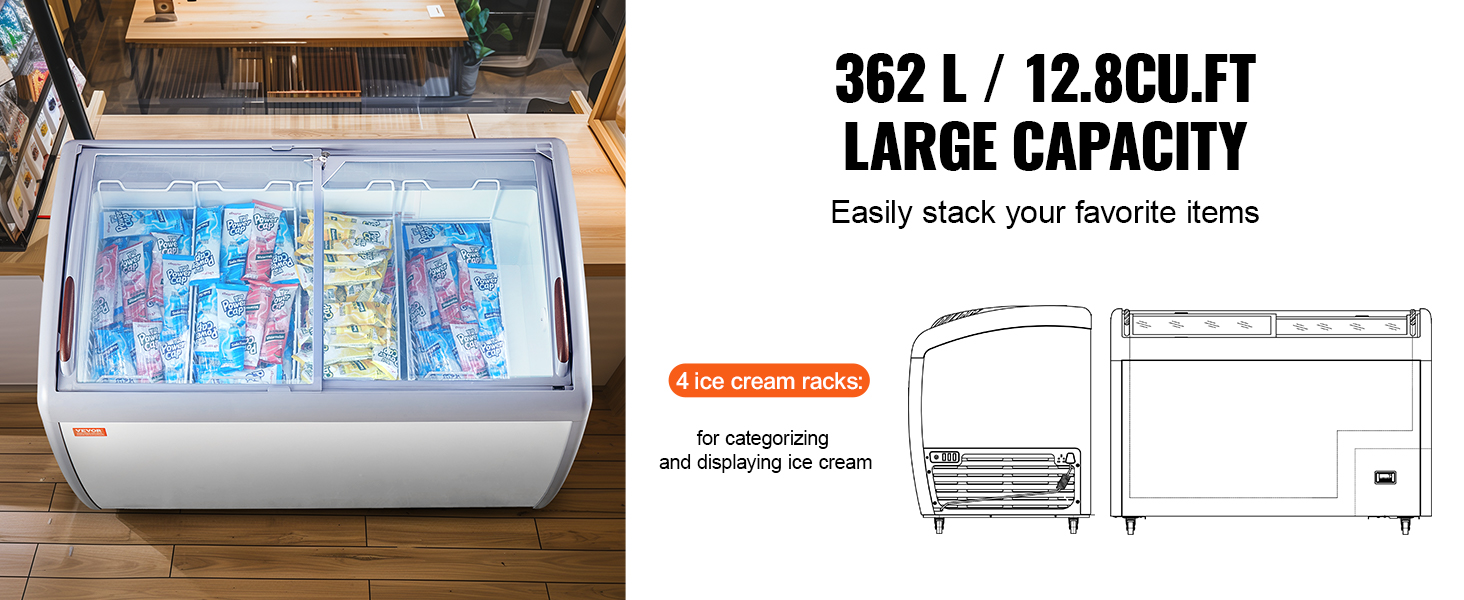 zmrzlinová vitrína s objemom 362 l so 4 drôtenými košíkmi, v ktorej možno vystaviť a skladovať rôzne príchute zmrzliny. Táto mraznička je vybavená viacstupňovou reguláciou teploty a systémom konštantnej teploty, ktorý šetrí energiu a je účinný.