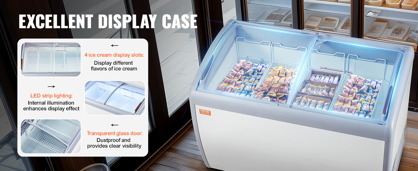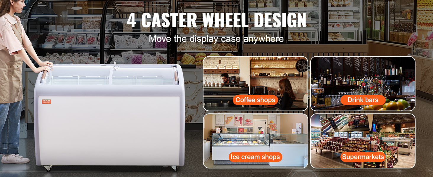 Mobilnú truhlicovú mrazničku so skleneným vrchom možno používať v kaviarňach, nápojových baroch, zmrzlinárňach, supermarketoch a na iných miestach, kde umožňuje dlhodobé vystavovanie zmrzliny.