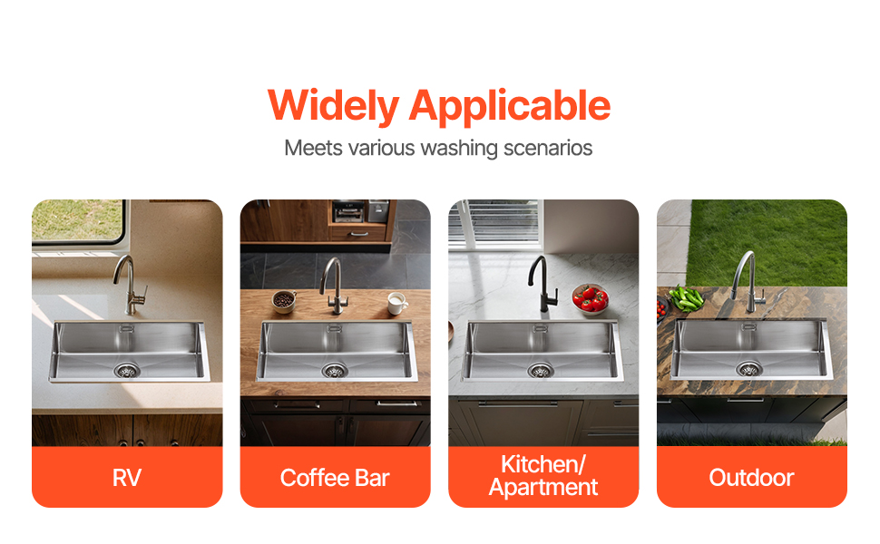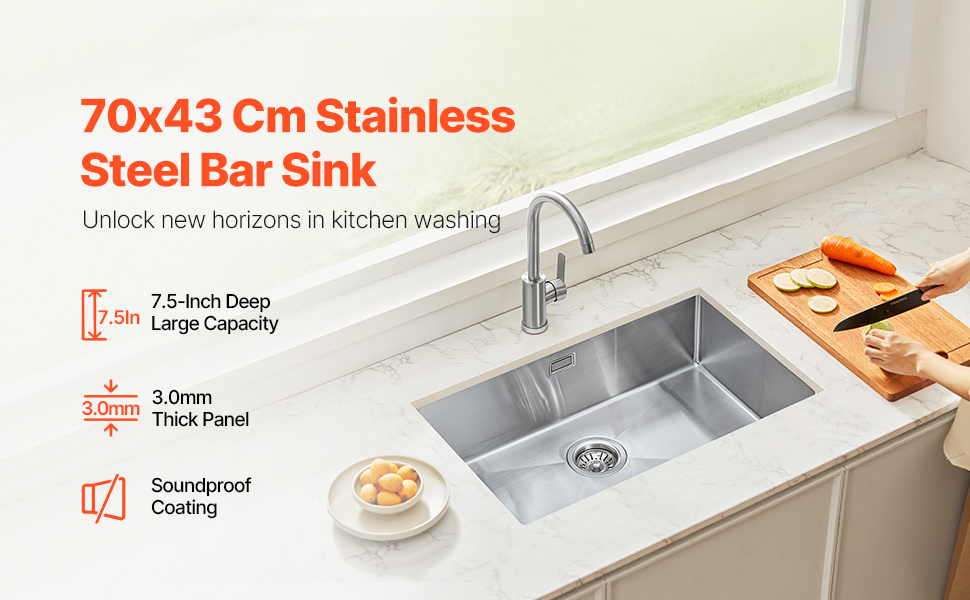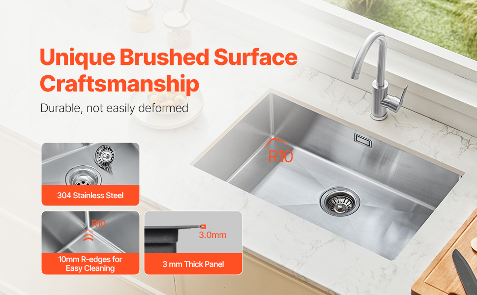 Podomietkový barový drez sa ľahko inštaluje, nevyžaduje si žiadne väčšie úpravy kuchynských skriniek ani pracovnej dosky. Mimoriadne hrubý 3 mm okraj z nehrdzavejúcej ocele 304 umožňuje bezpečnú inštaláciu; hrubé telo drezu zaručuje odolnosť.