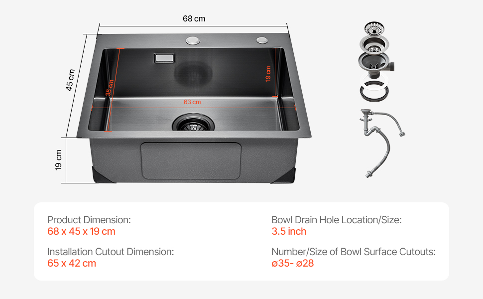 Vonkajšie rozmery: 68x45 cm. Vnútorný rozmer: 65x42 cm. Extra hĺbka 19 cm je ideálna na umývanie veľkého kuchynského riadu. Jeho moderný dizajn zaručuje dlhodobé používanie v rušnej kuchyni. Pred kúpou si overte, či sa hodí na vašu kuchynskú linku.