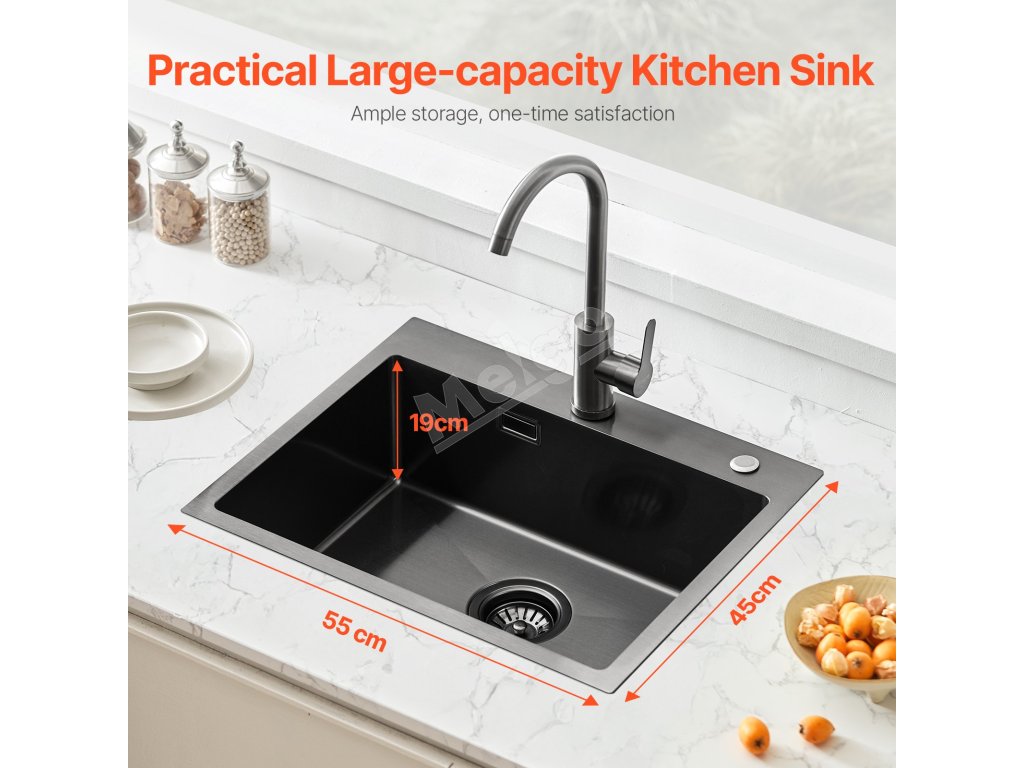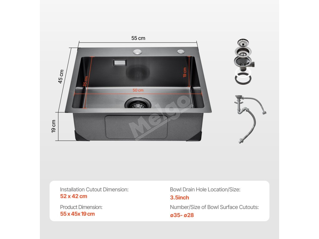 Vonkajšie rozmery: 55x45 cm. Vnútorný rozmer: 52x42 cm. Extra hĺbka 19 cm je ideálna na umývanie veľkého kuchynského riadu. Jeho moderný dizajn zaručuje dlhodobé používanie v rušnej kuchyni. Pred kúpou si overte, či sa hodí na vašu kuchynskú linku.