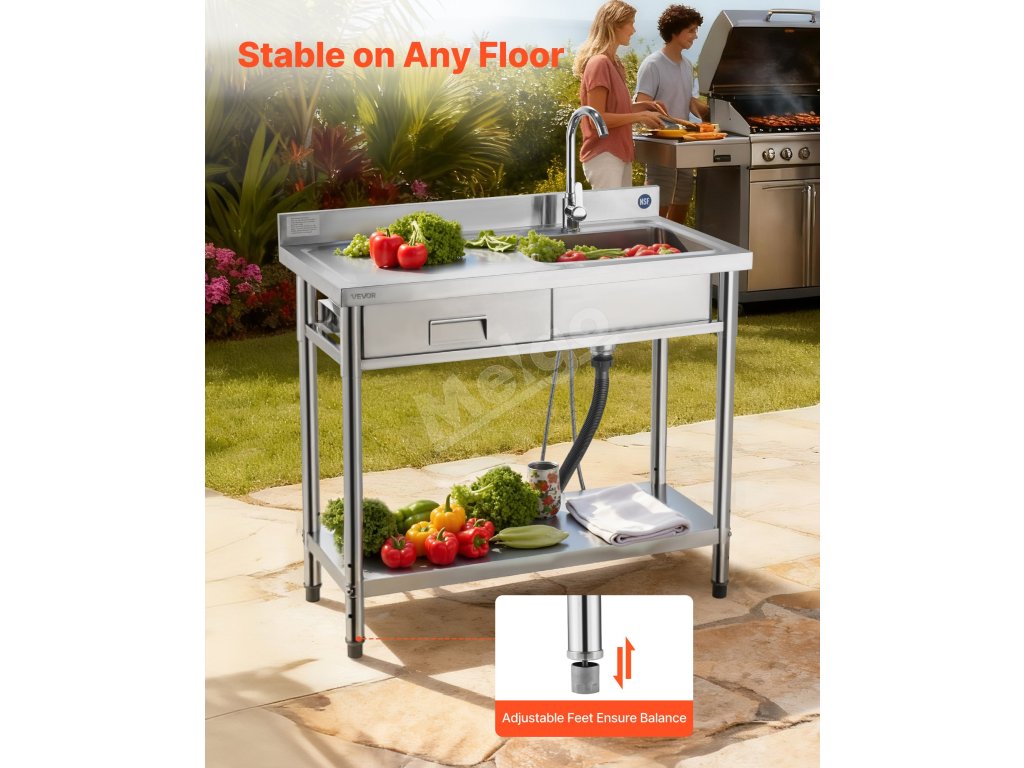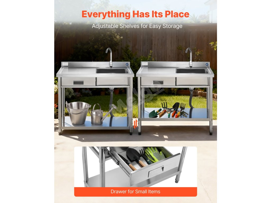 Dizajn 4 v jednom integruje pracovný stôl, drez, nastaviteľnú odkladaciu poličku a praktickú zásuvku, čím zjednodušuje umývanie a organizáciu v jednom kroku. Priestranný drez zvládne akúkoľvek čistiacu úlohu, nastaviteľné spodné police poskytujú flexibilný úložný priestor a zásuvka udržiava náradie a drobné predmety na dosah.