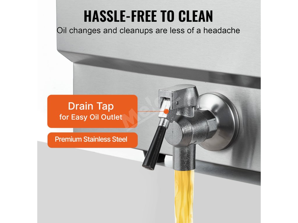 Vďaka nezávislému termostatickému ovládaniu môžete ľahko nastaviť teplotu od 122°F do 392°F (50-200 °C). Komerčná fritéza sa automaticky vypne, ak teplota prekročí 446°F (230°C) alebo ak dôjde k poruche regulátora teploty.