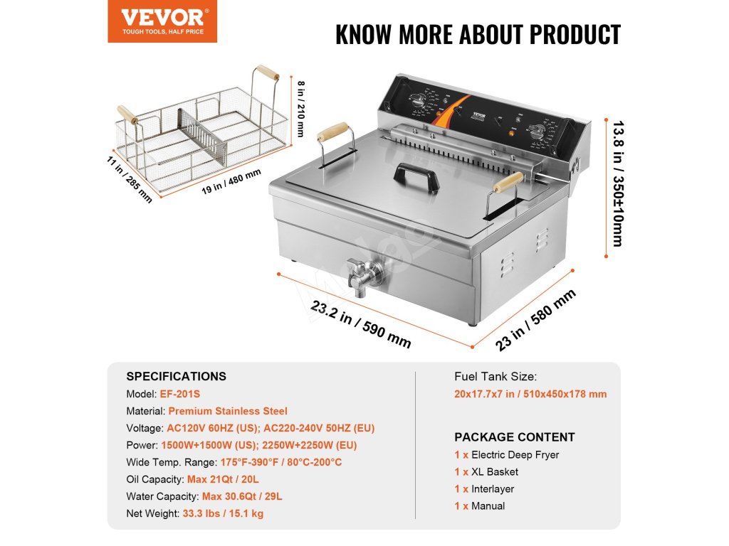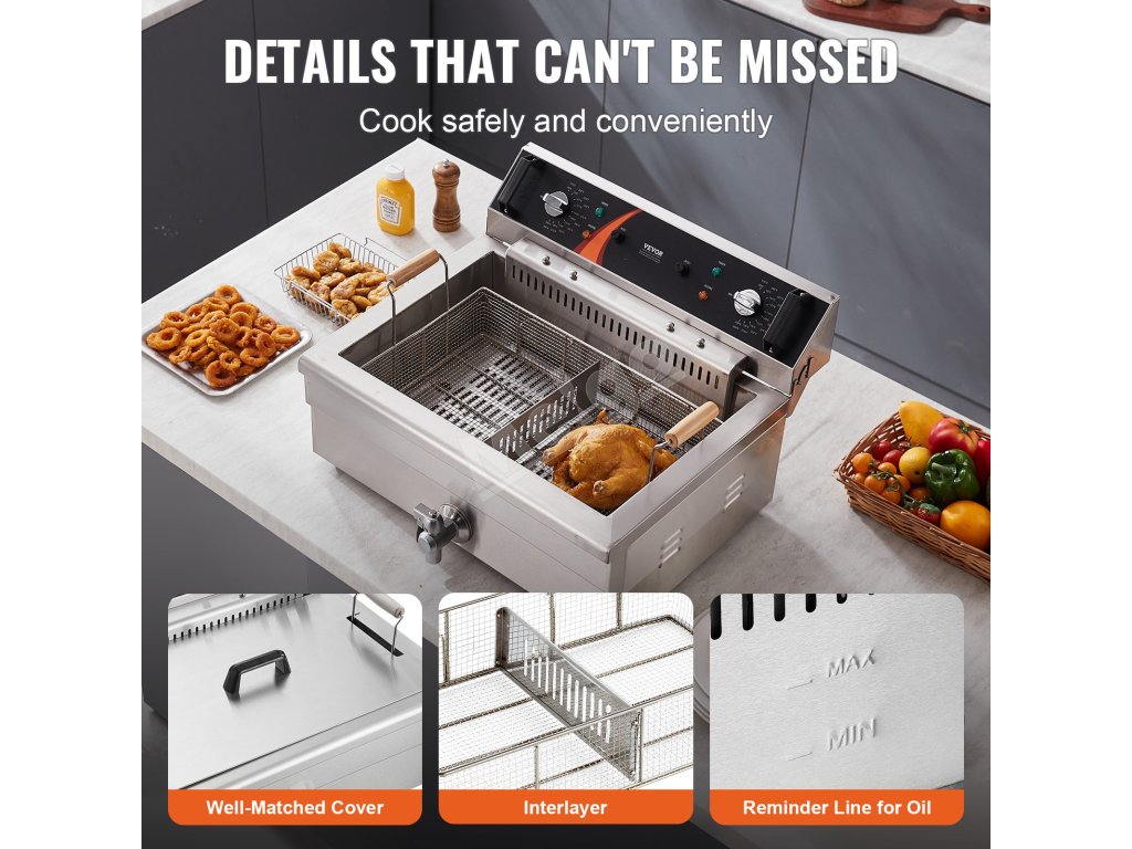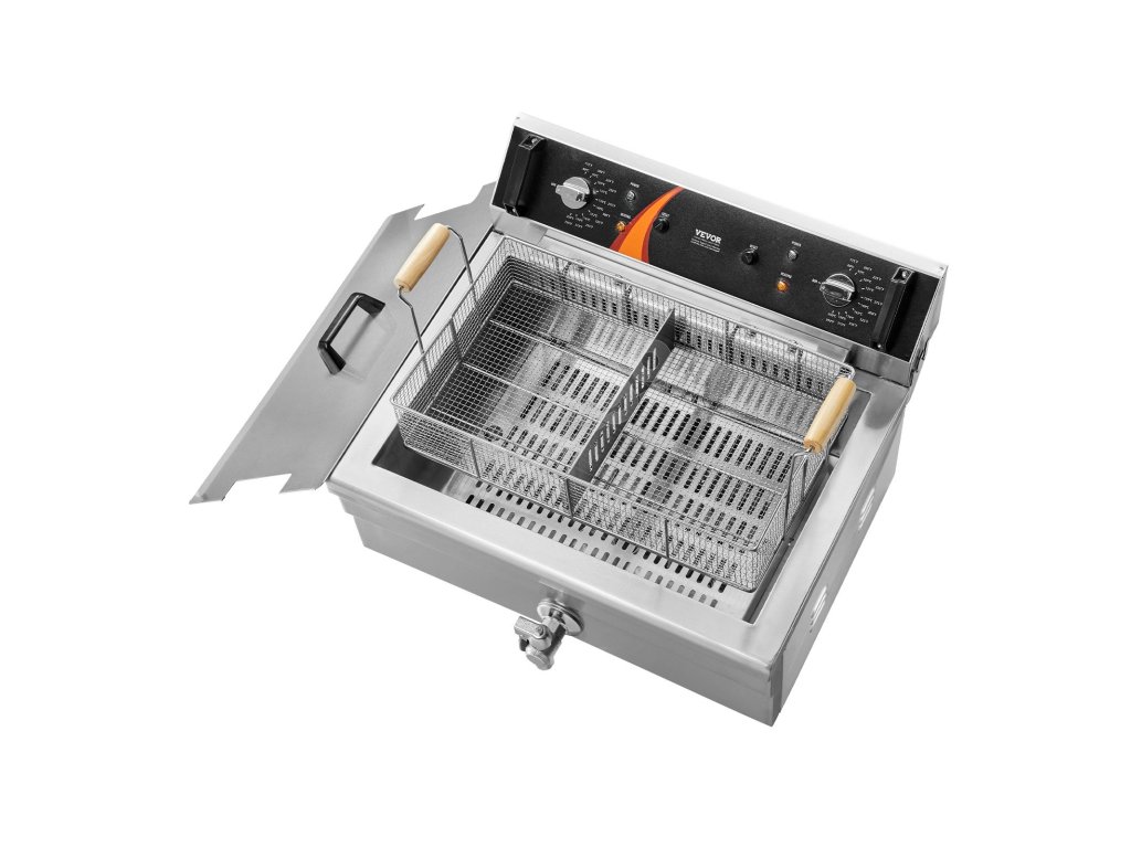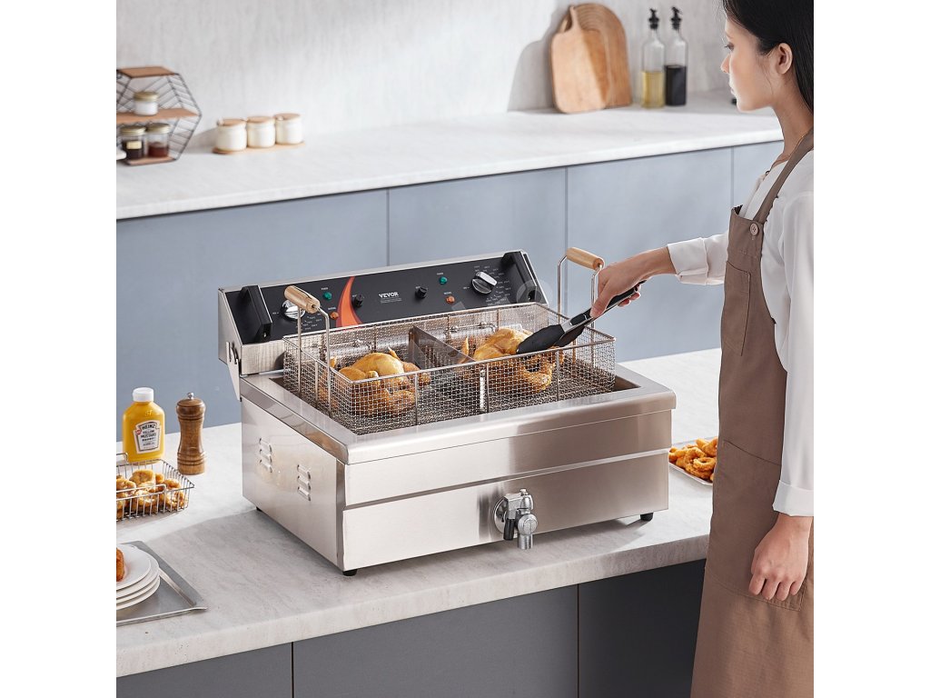 Táto komerčná elektrická fritéza umožňuje fritovanie veľkých potravín, ako sú celé kurčatá, v priestrannom koši. Obsahuje medzivrstvu, ktorá je ideálna na samostatné vyprážanie rôznych potravín.