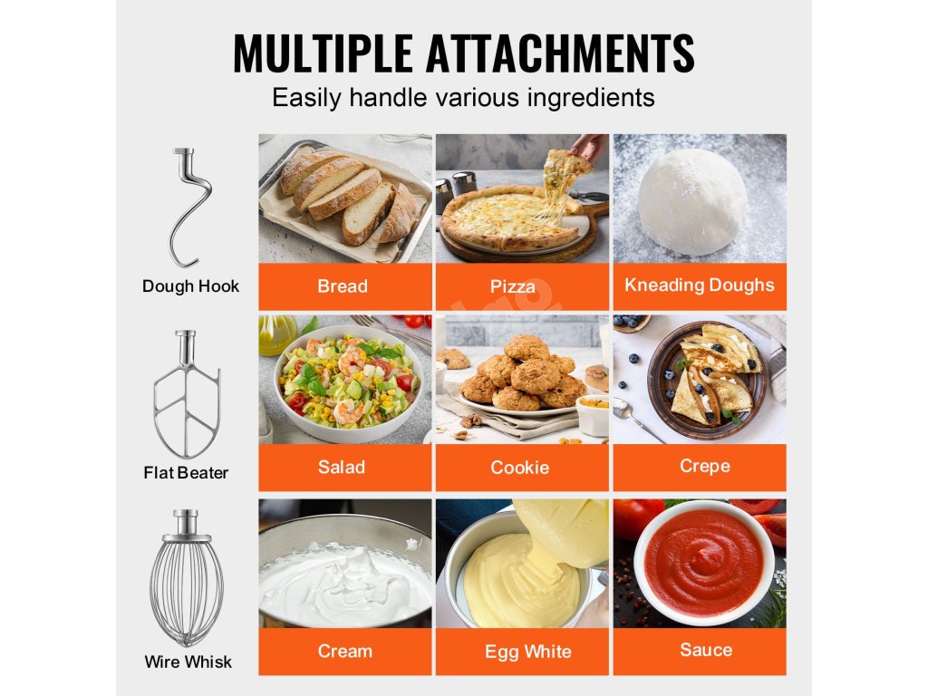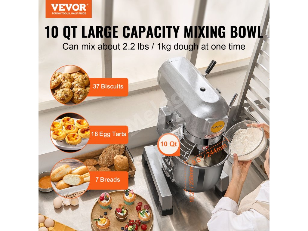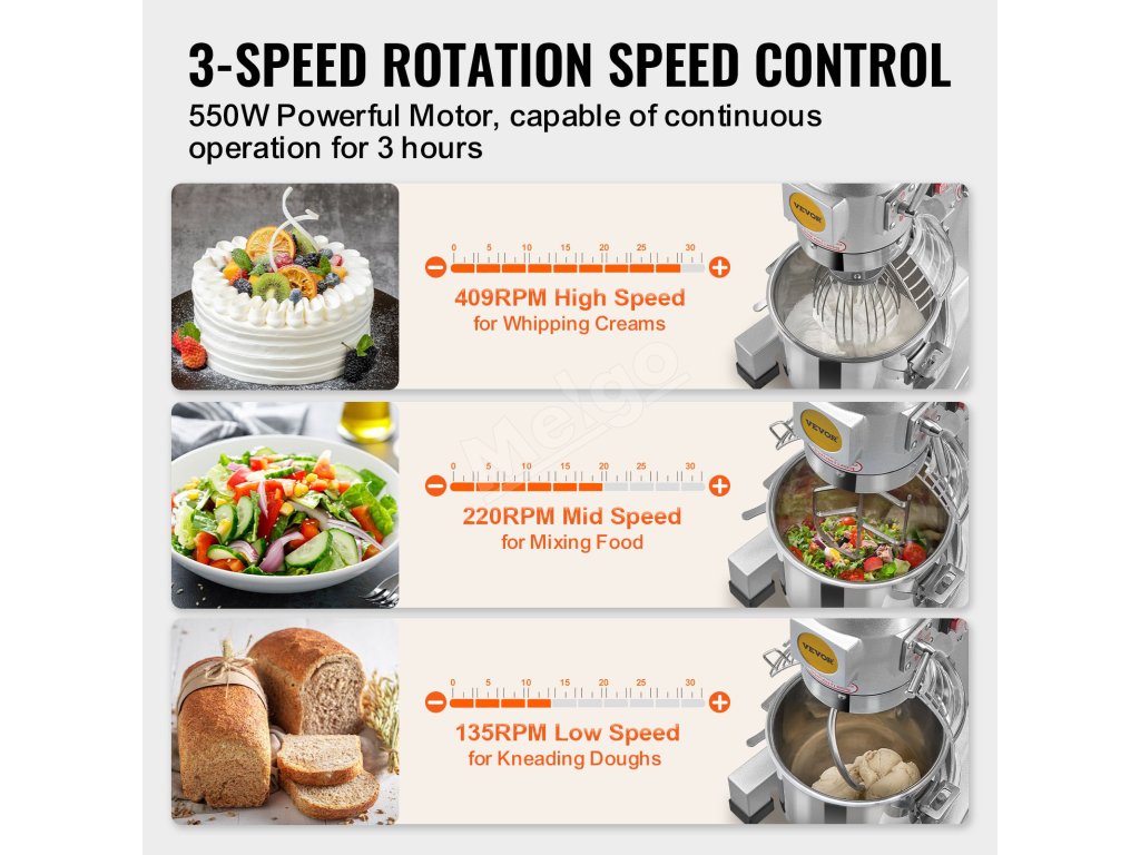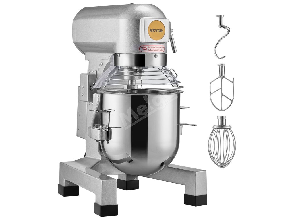 Komerčný mixér VEVOR s mixovacou nádobou s objemom 10 l, ideálny na mixovanie veľkého množstva potravín naraz. Je vybavený výkonným motorom s 3 nastaviteľnými rýchlosťami (vysoká 409 ot/min, stredná 220 ot/min, nízka 135 ot/min) a dodáva sa s 3 mixovacími nadstavcami, ktoré bez námahy zvládnu rôzne prísady.