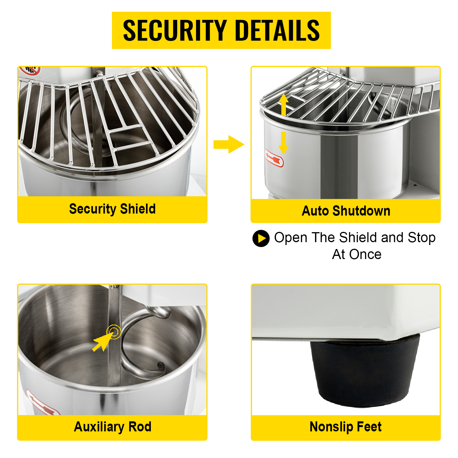 Bezpečný štít môže zabrániť náhodnému poraneniu. Vďaka funkcii automatického vypnutia sa tento stroj okamžite zastaví, akonáhle sa štít otvorí alebo nie je pevne zatvorený. Pomocná tyč zabezpečuje úplný a stabilný proces miešania. Protišmykové nožičky zabezpečujú stabilitu tohto miešača.