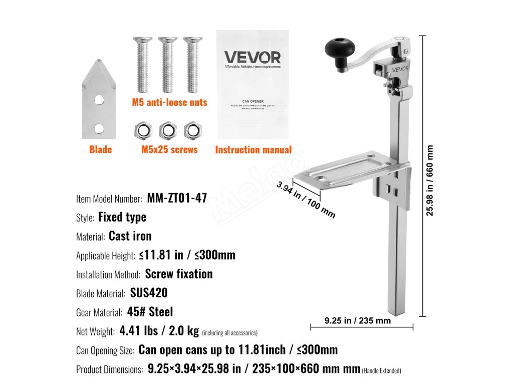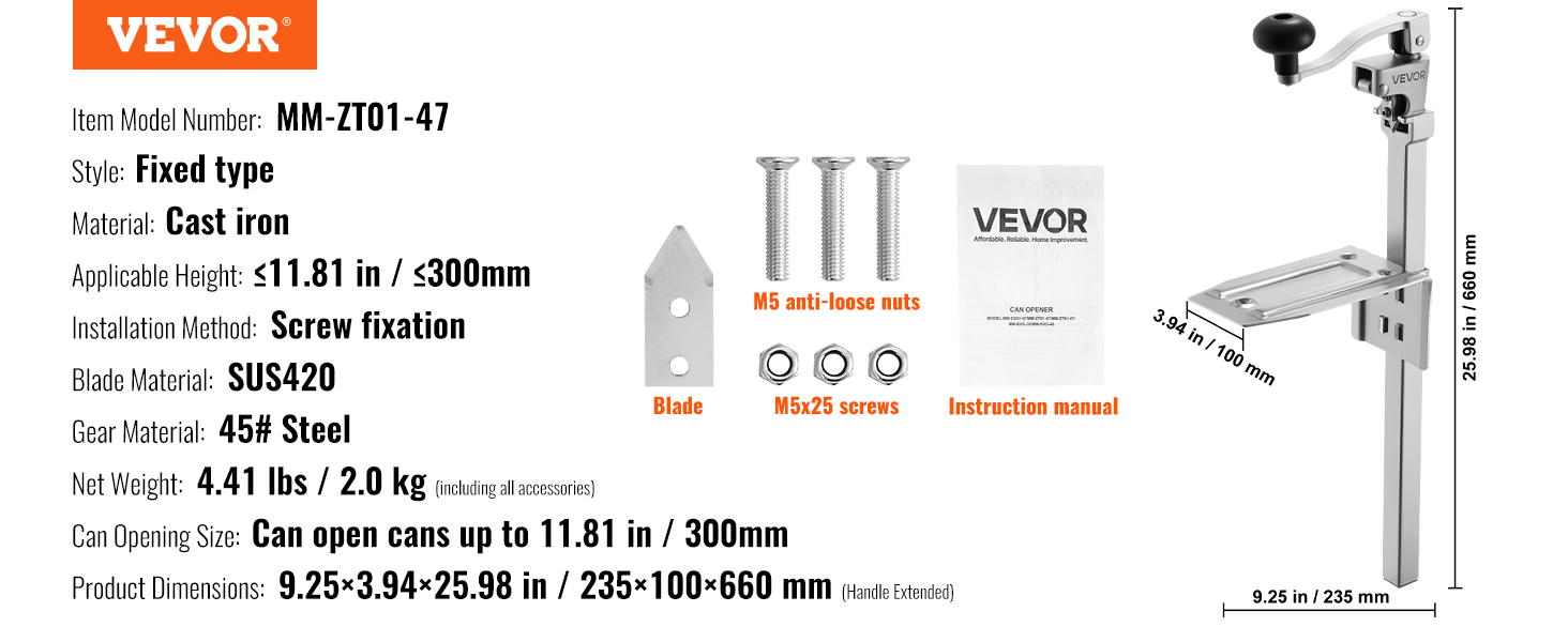 Tento otvárač na konzervy pomáha rýchlo a efektívne krájať konzervy. Je všestranný, dokáže rezať plechovky s priemerom až 11,81 palca, čím zabezpečuje rýchle a efektívne otváranie plechoviek.
