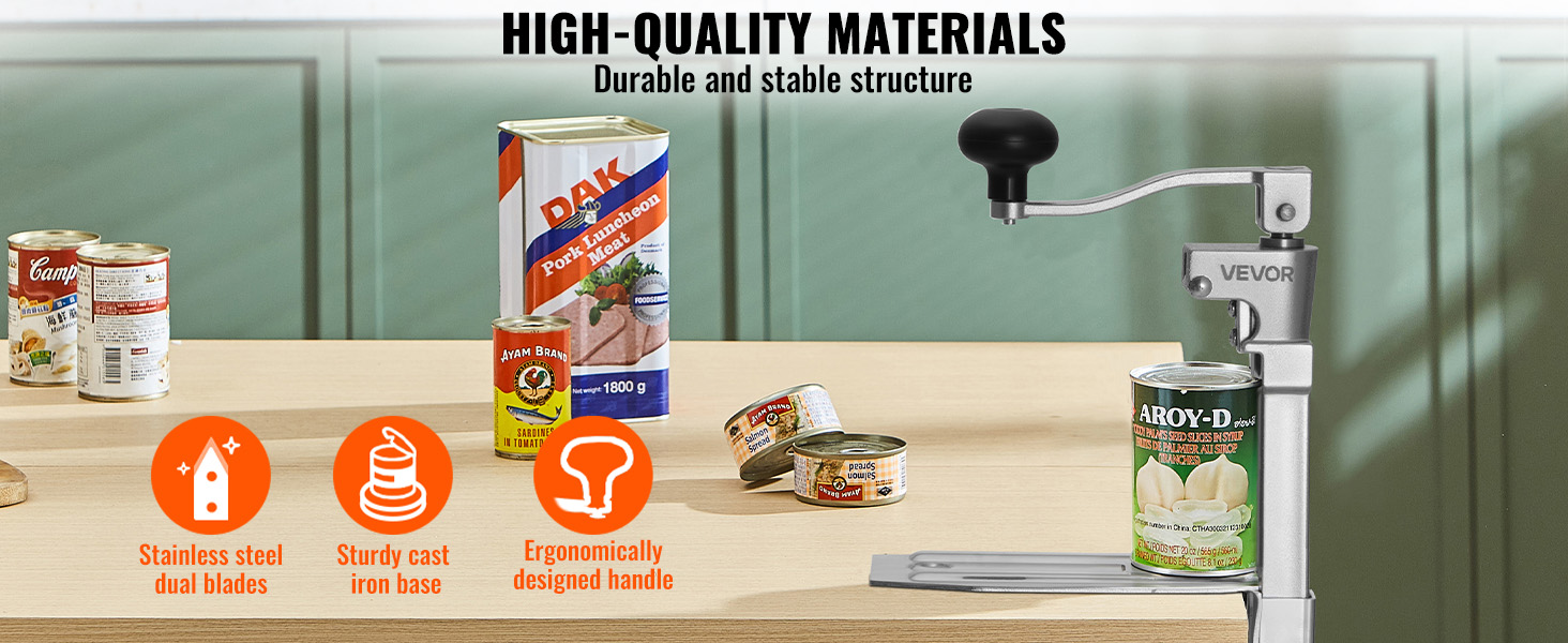Náš komerčný otvárač konzerv je vyrobený z vybraných vysokokvalitných materiálov. Dvojité čepele z nehrdzavejúcej ocele SUS420 zabezpečujú ostrejšie rezanie; stabilná liatinová základňa poskytuje dlhodobé používanie bez prevrátenia; a ergonomicky navrhnutá rukoväť umožňuje hladké a bezproblémové otváranie každého veka.