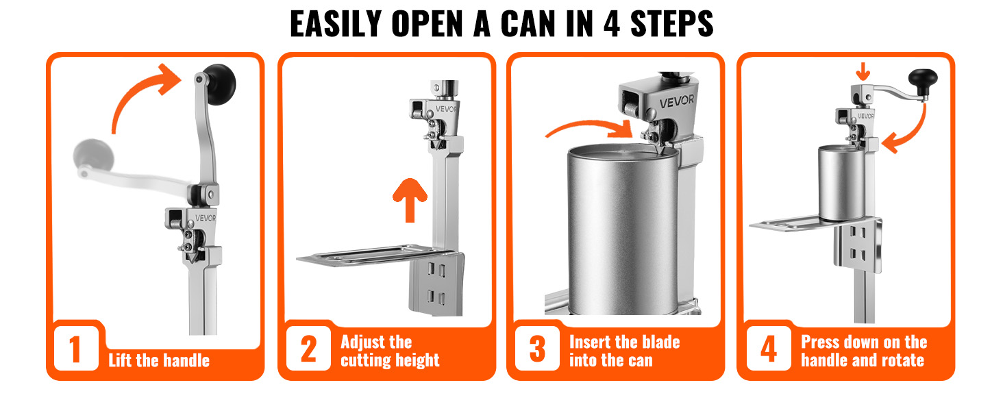 Obsluha tohto otvárača konzerv pre náročné prevádzky je mimoriadne jednoduchá. Na dokončenie procesu otvárania plechoviek sú potrebné len štyri kroky, vďaka čomu je rýchle a efektívne a ľahko ho zvládnu aj začiatočníci.