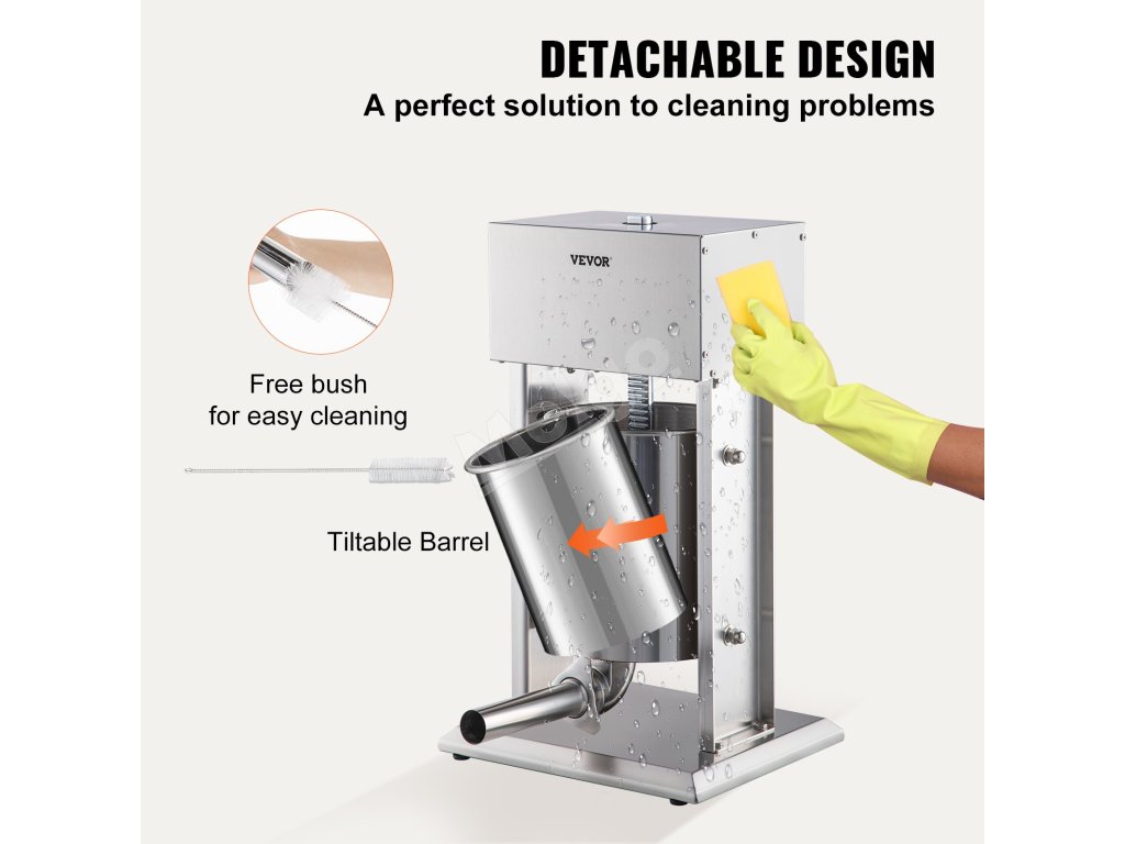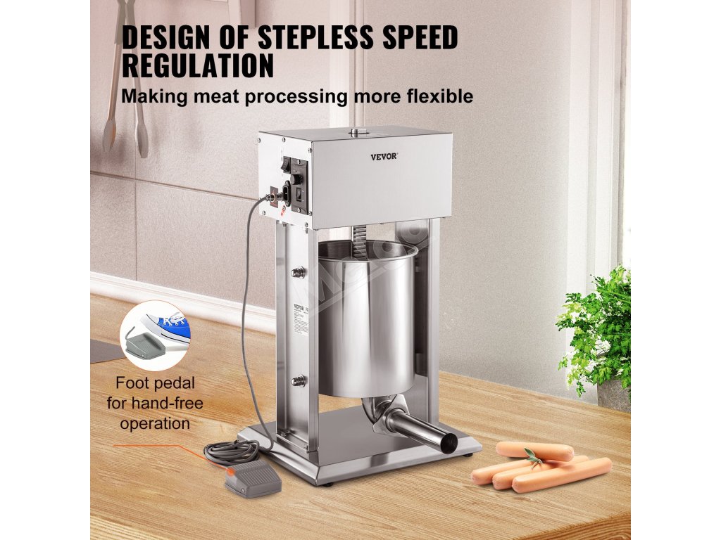 Prijíma 200W účinný motor, ktorý pracuje rýchlo a stabilne po dlhú dobu bez tlaku. Jedna osoba môže bez námahy dokončiť celý proces výroby klobás pomocou nožného spínača.