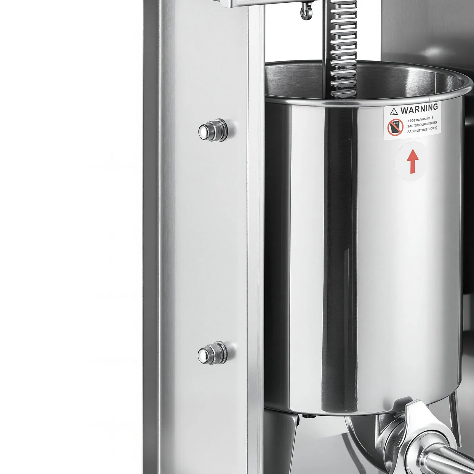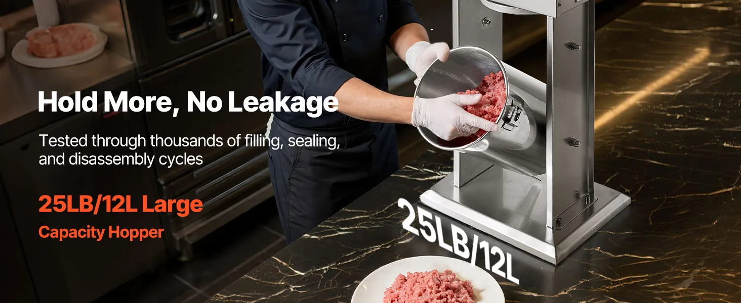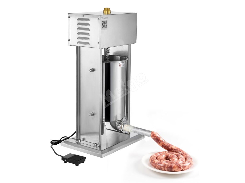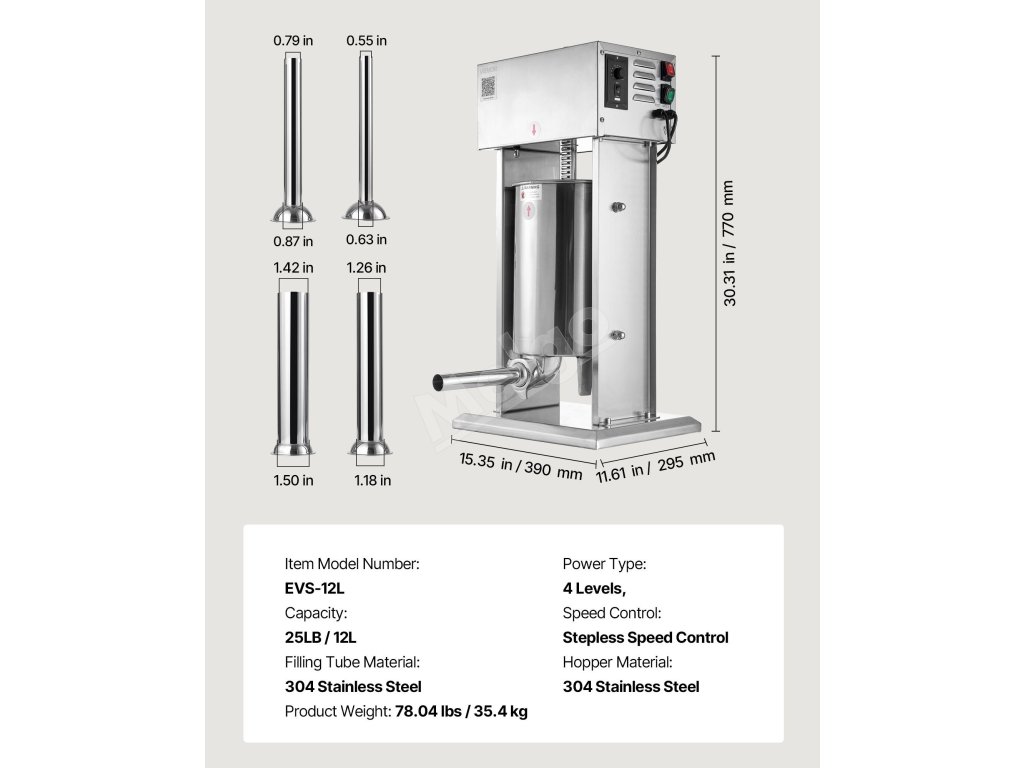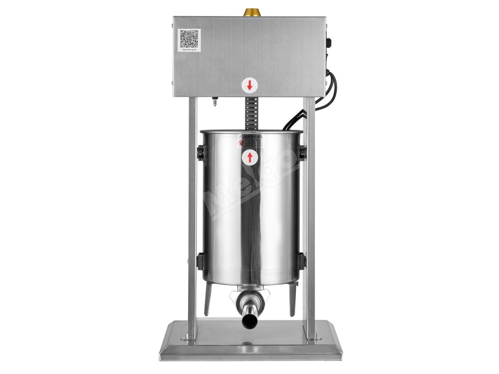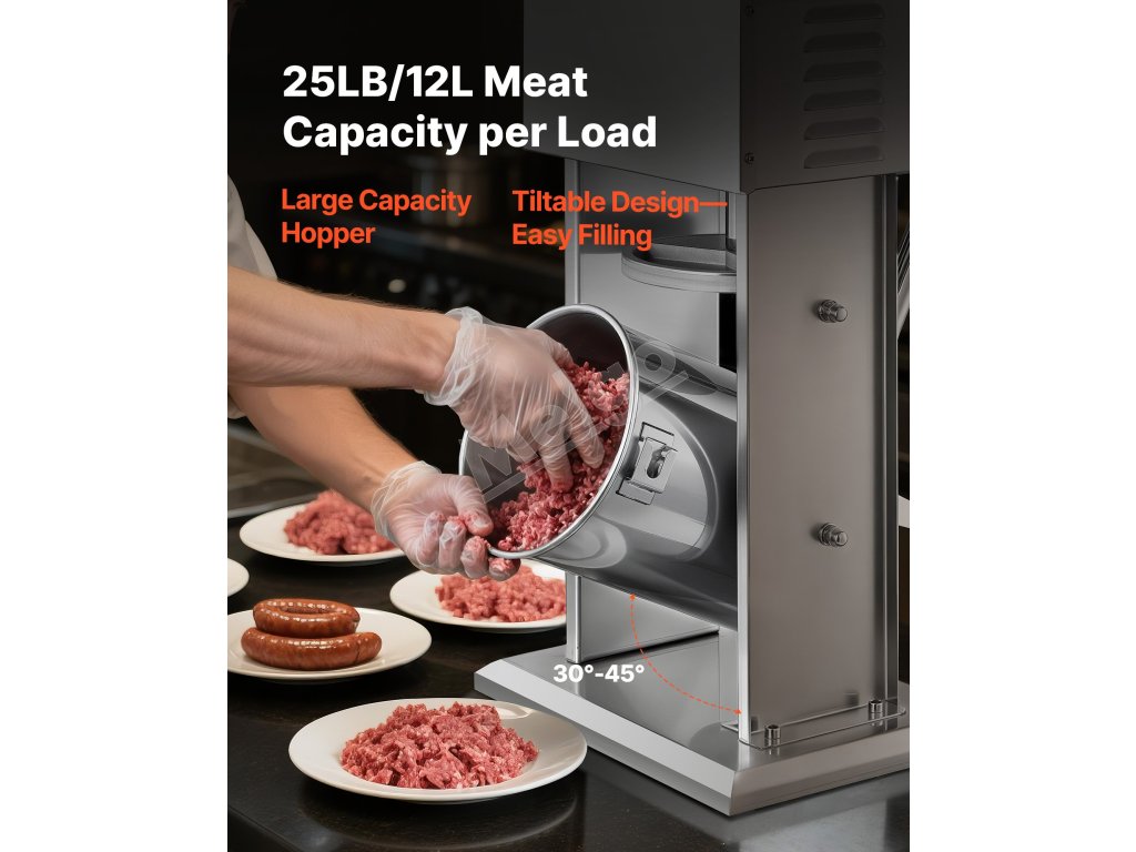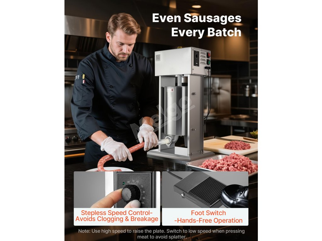 Táto elektrická plnička klobás je vybavená vylepšenou prítlačnou doskou s výfukovými otvormi pre pevnejšie klobásy s nízkym obsahom bublín. Plynulá regulácia otáčok zvyšuje účinnosť a jeho veľká kapacita 25 lbs / 12 l je ideálna pre reštaurácie, supermarkety a iné komerčné zariadenia.